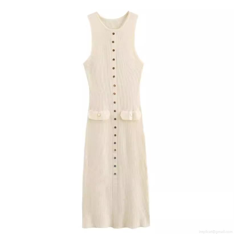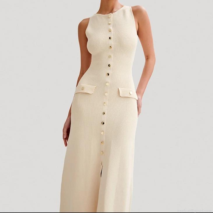 • Women's Elegant Knitted Midi Dress Sleeveless Ribbed Slim Fit Bodycon Pencil Dress With Gold Decorative Buttons And Fake Pockets For Casual Daily Party Spring Summer Cream Apricot
