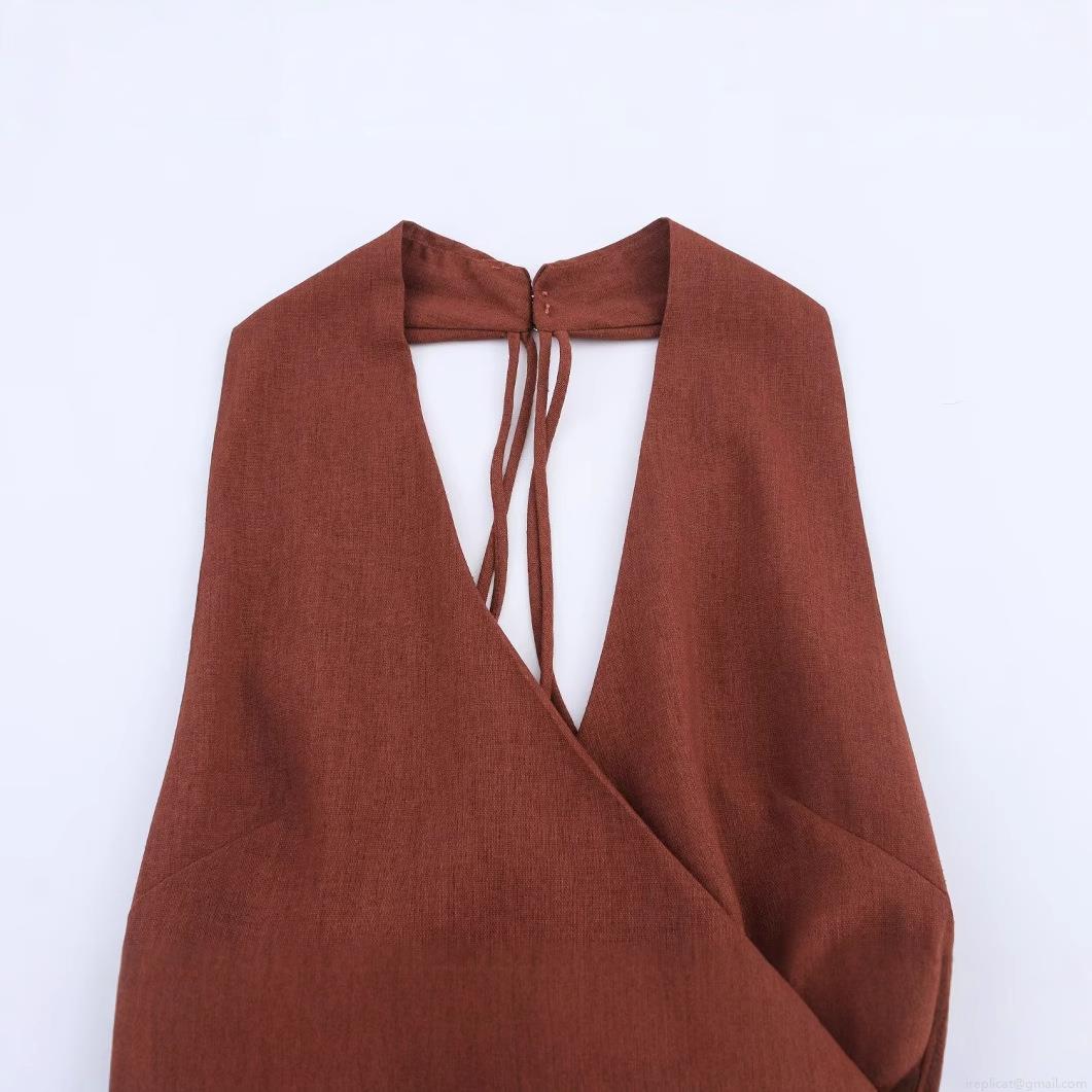 • Women's Elegant Linen Blend Halter Backless Midi Dress With Gold Metal Ring Detail Sleeveless Solid Brown Party Evening Dress