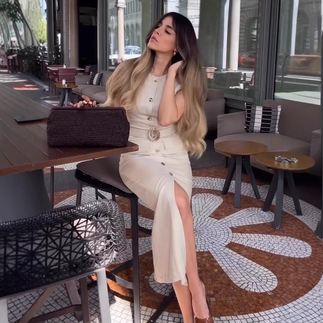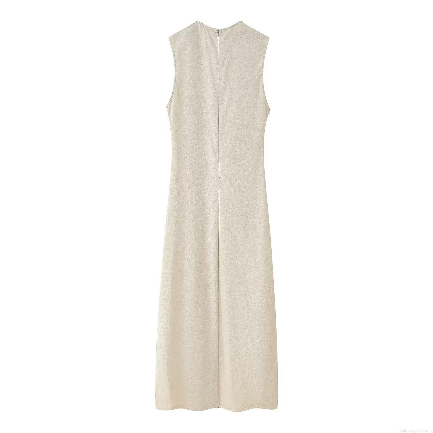 • Women's Elegant Linen Blend Polyester Midi Dress Sleeveless Round Neck Button Front Belted Dress With Pockets Slim Fit Summer Casual Sun Dress For Ladies