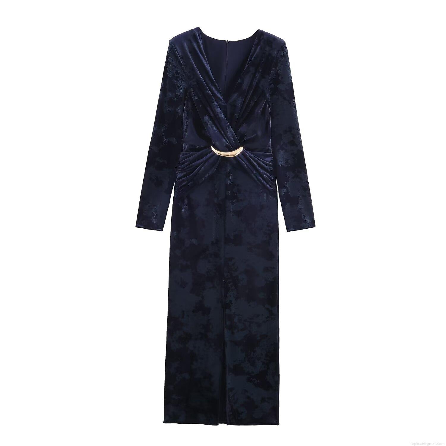 Women's Elegant Navy Blue Velvet Midi Dress Deep V-Neck Long Sleeve Slim Fit With Crescent Moon Accessory For Evening Party Autumn Fashion