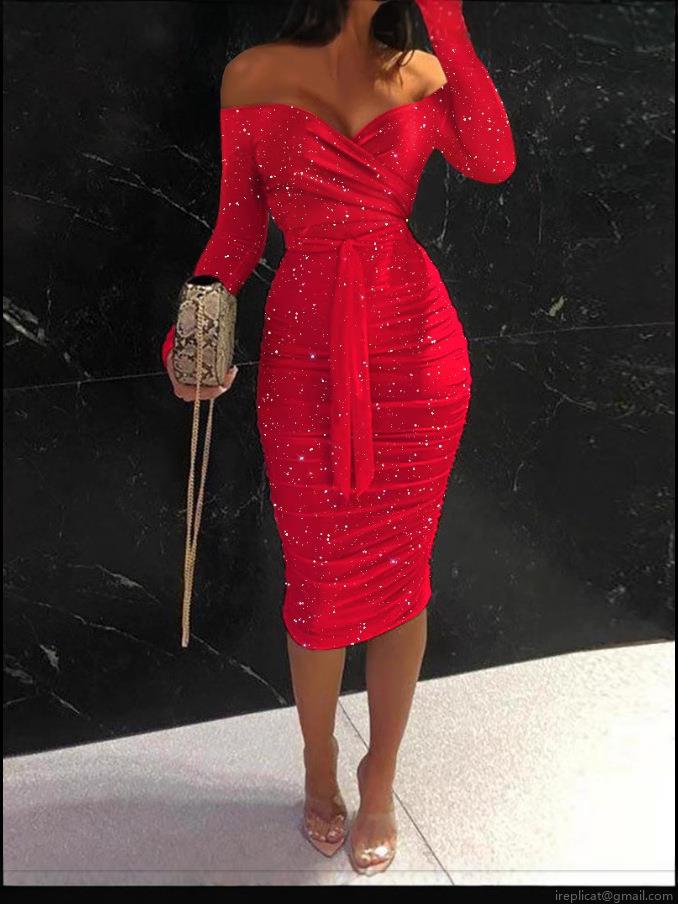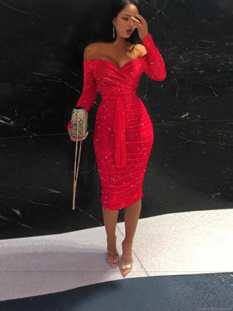 • Women's Elegant Off Shoulder Sequin Midi Dress Long Sleeve Bodycon Wrap Tie Waist Glitter Evening Party Cocktail Dress For Wedding Banquet