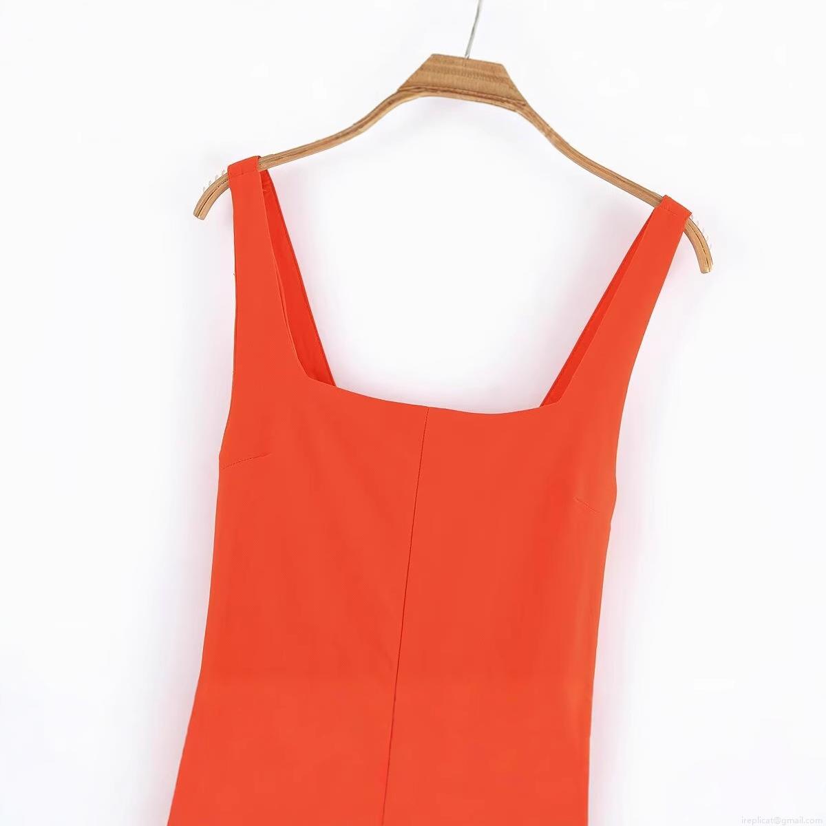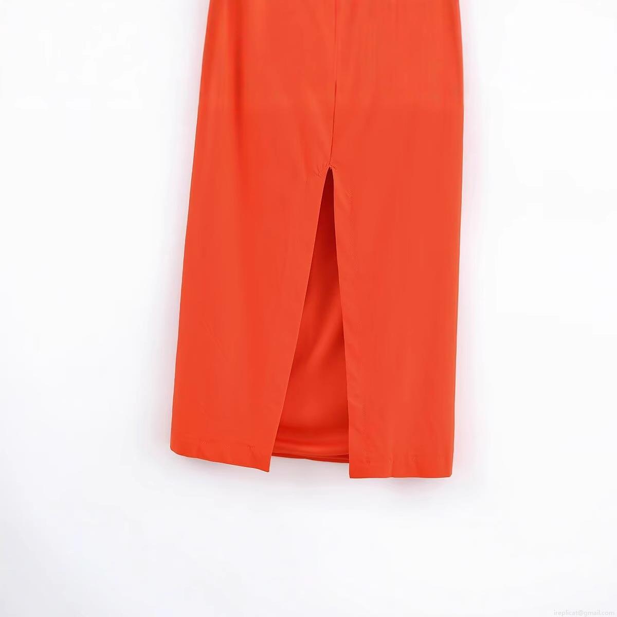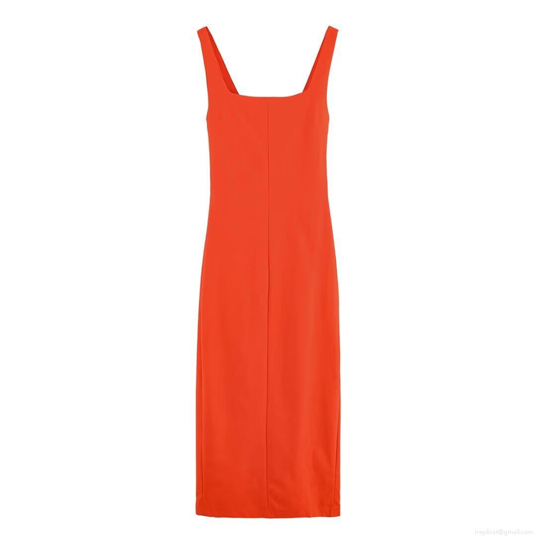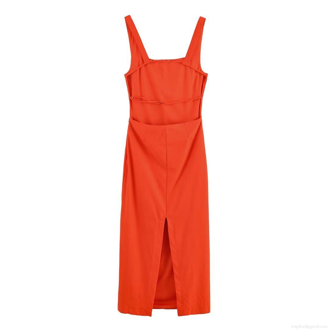 • Women's Elegant Orange Red Backless Midi Dress Square Neck Sleeveless Tie Back Split Slim Fit Evening Party Dress For Women