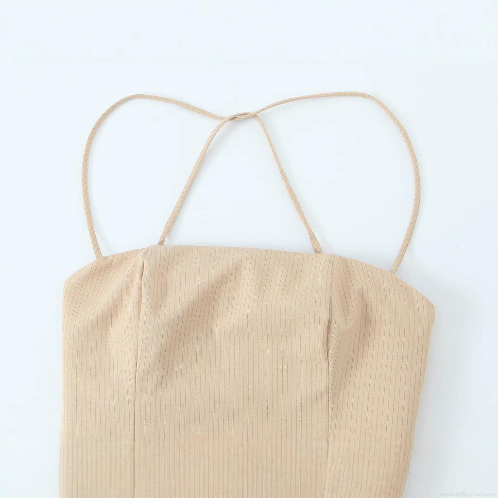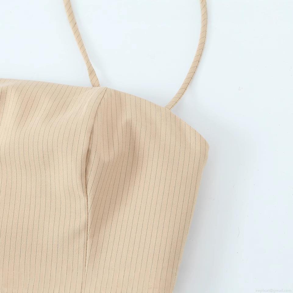 Pinstripes, Cross Shoulder Straps, Rough Texture, Split Design, Concealed Zipper On The Back