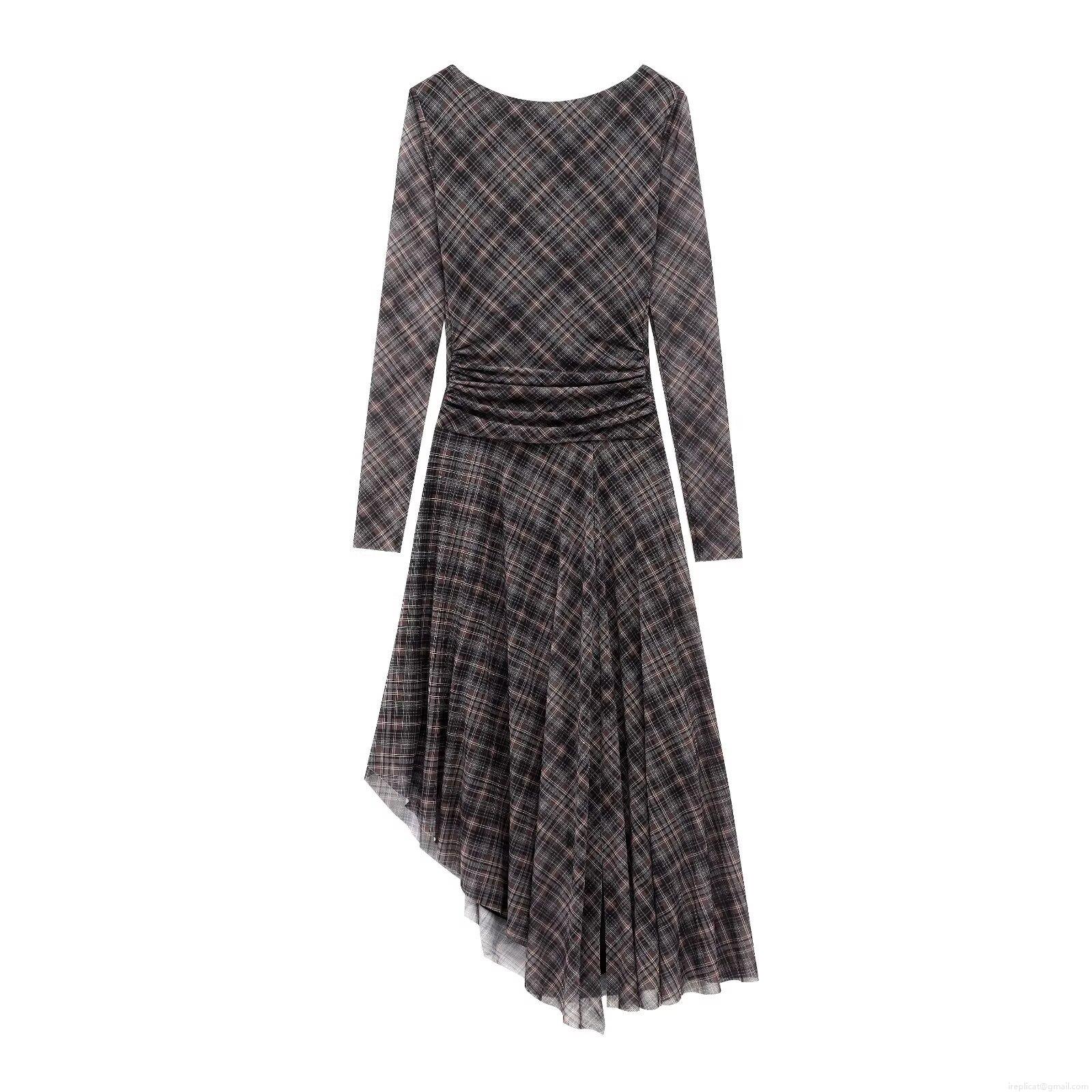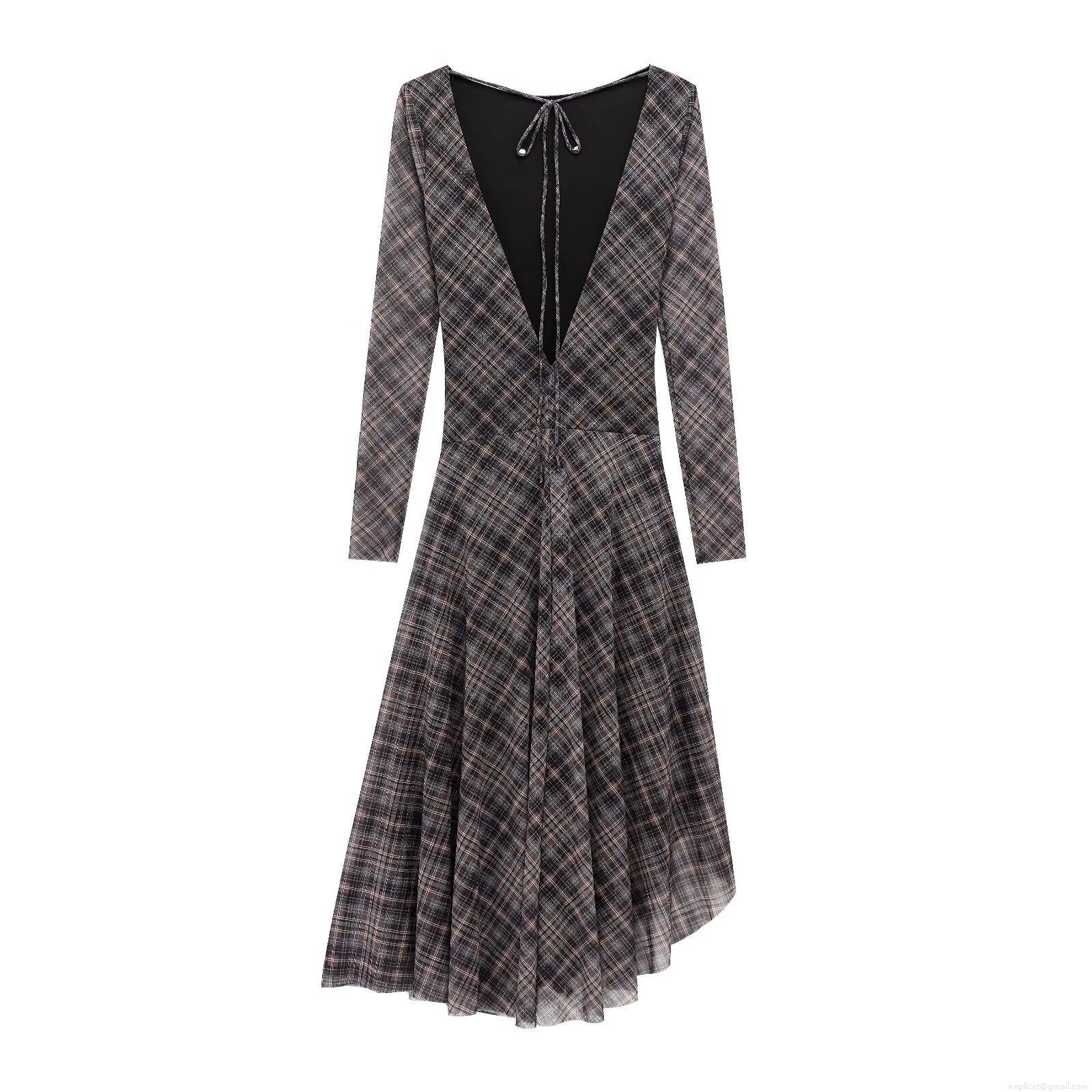 • Women's Elegant Plaid Mesh Long Sleeve Dress Backless V-Neck Tie Ruched Pleated Irregular Hem Party Evening Sexy Midi Maxi Dress