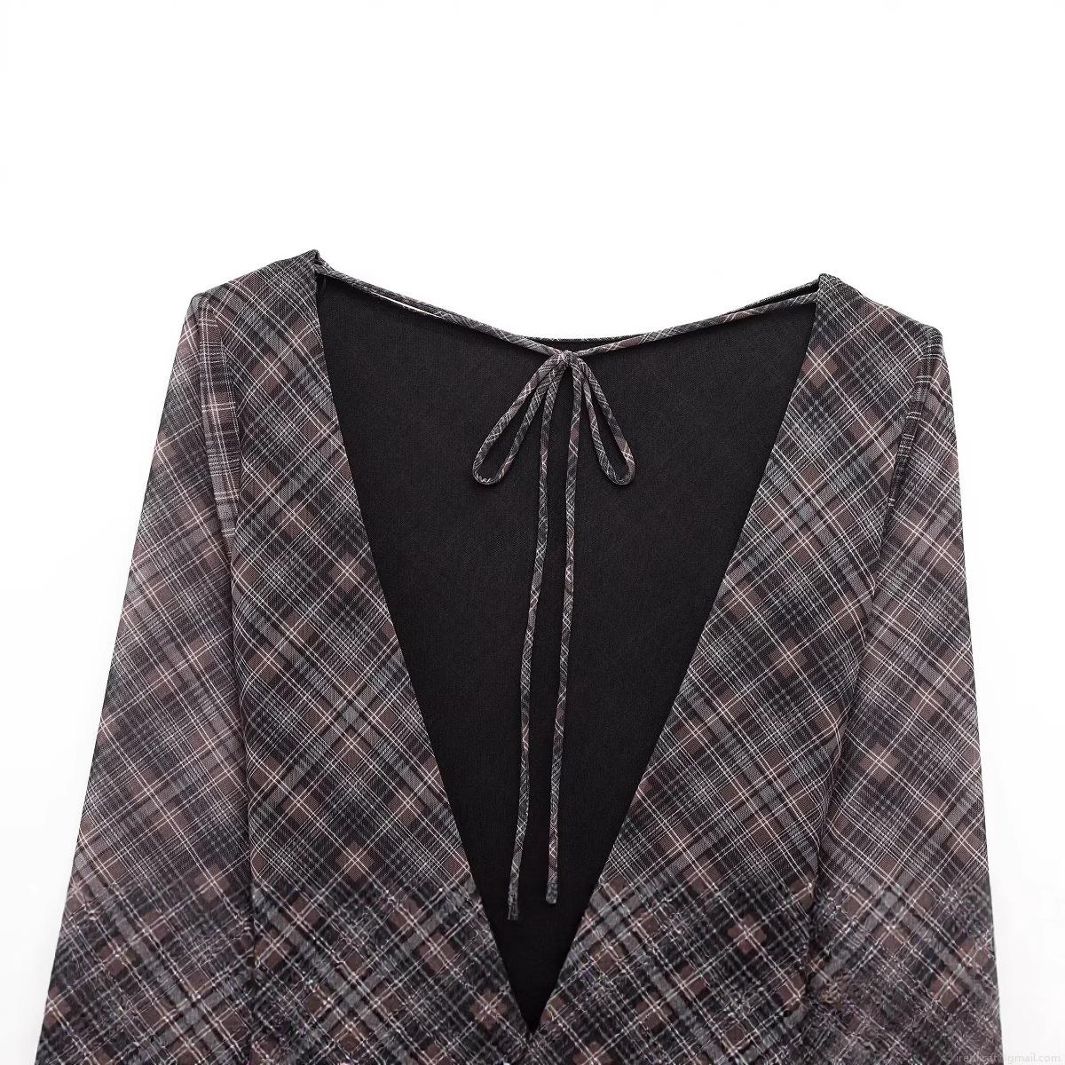 Women's Elegant Plaid Mesh Long Sleeve Dress Backless V-Neck Tie Ruched Pleated Irregular Hem Party Evening Sexy Midi Maxi Dress