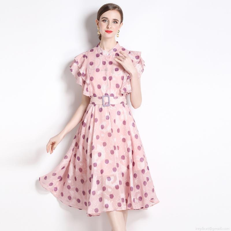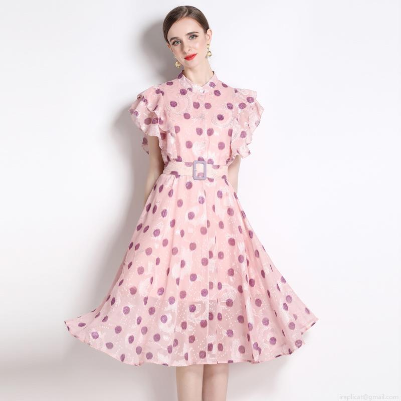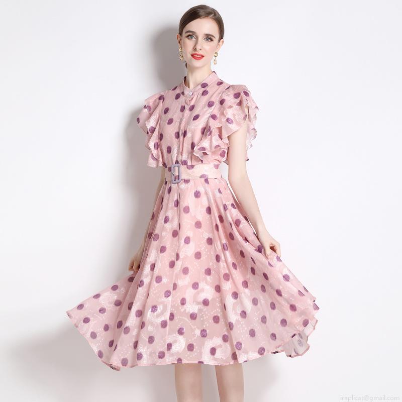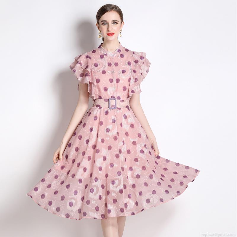 • Women's Elegant Polka Dot Chiffon Dress Stand Collar Ruffle Sleeve High Waist A-line Big Swing Midi Dress With Belt For Summer Party Commute