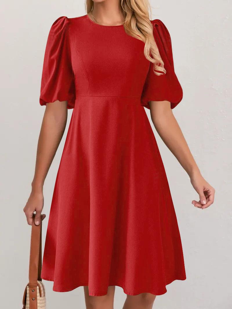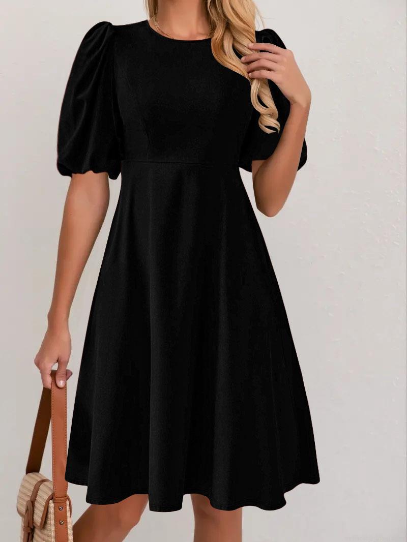 • Women's Elegant Puff Short Sleeve Midi Dress Solid Color Round Neck A-Line Slim Fit Casual Polyester Spandex Dress For Daily Party Lady