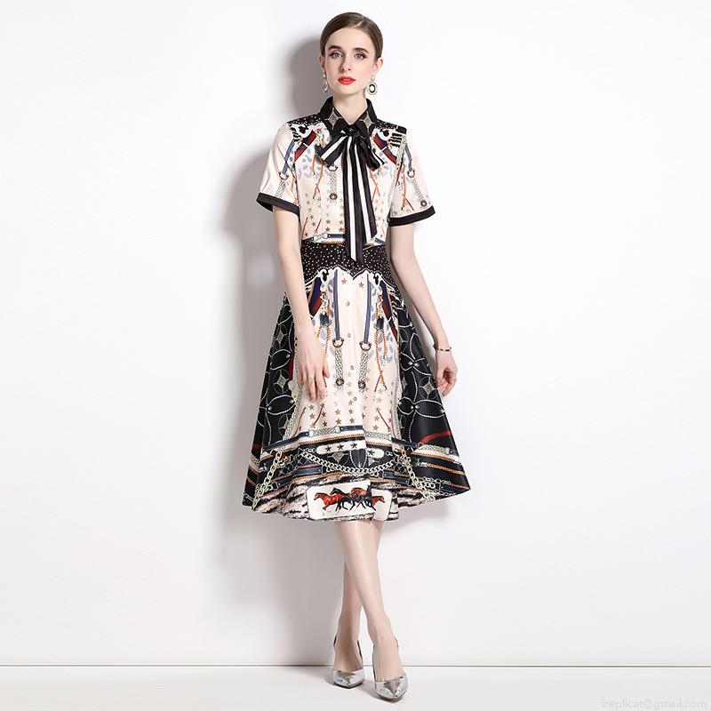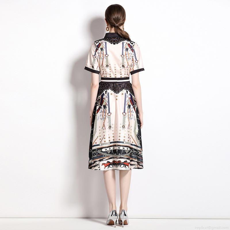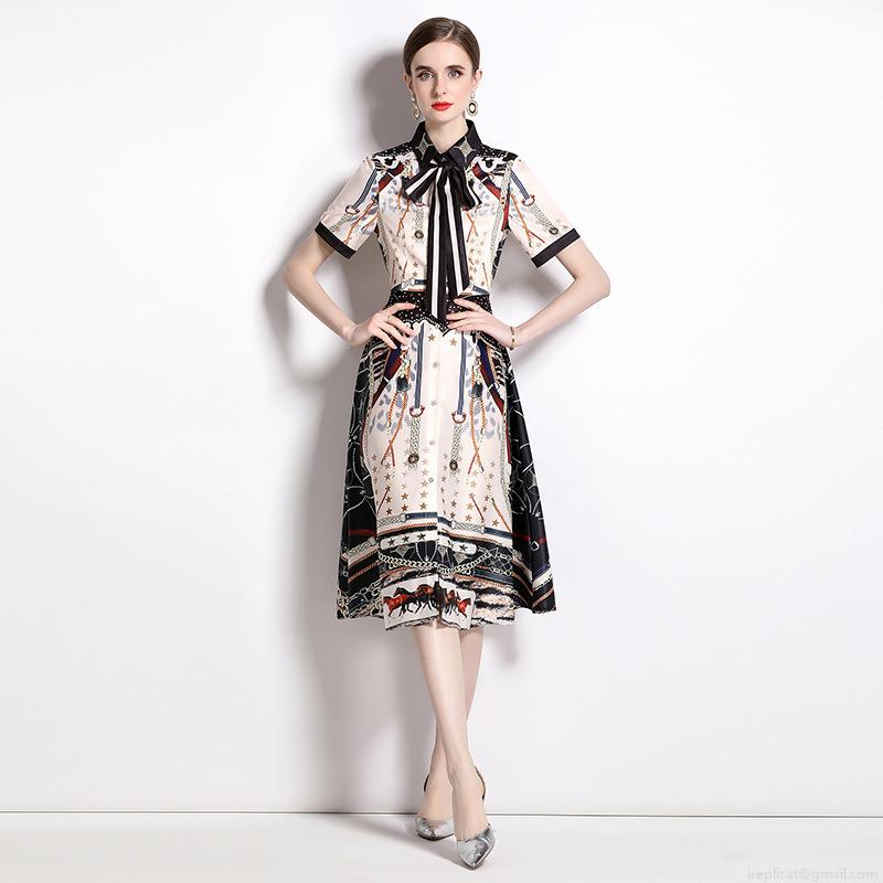 • Women's Elegant Retro Horse Chain Print Midi Dress Short Sleeve Polo Collar With Bow Tie Belt Slim Fit A-Line Office Party Dress For Ladies