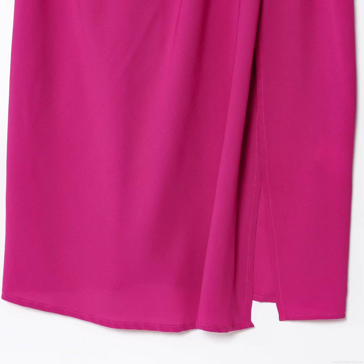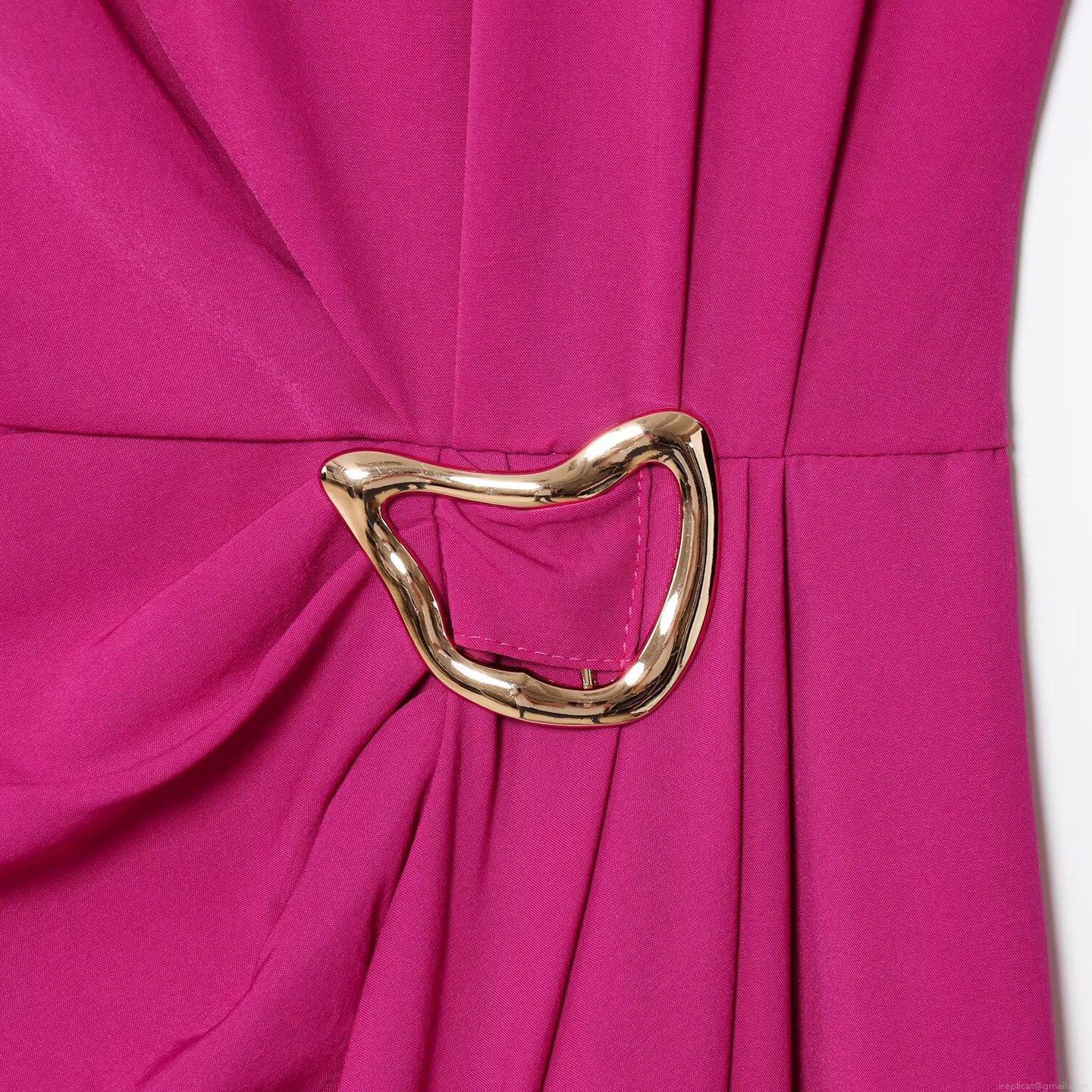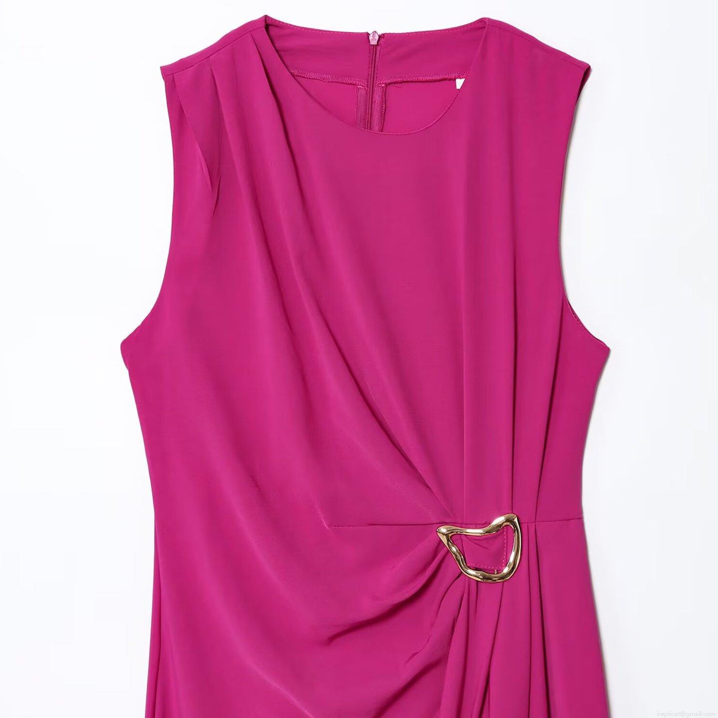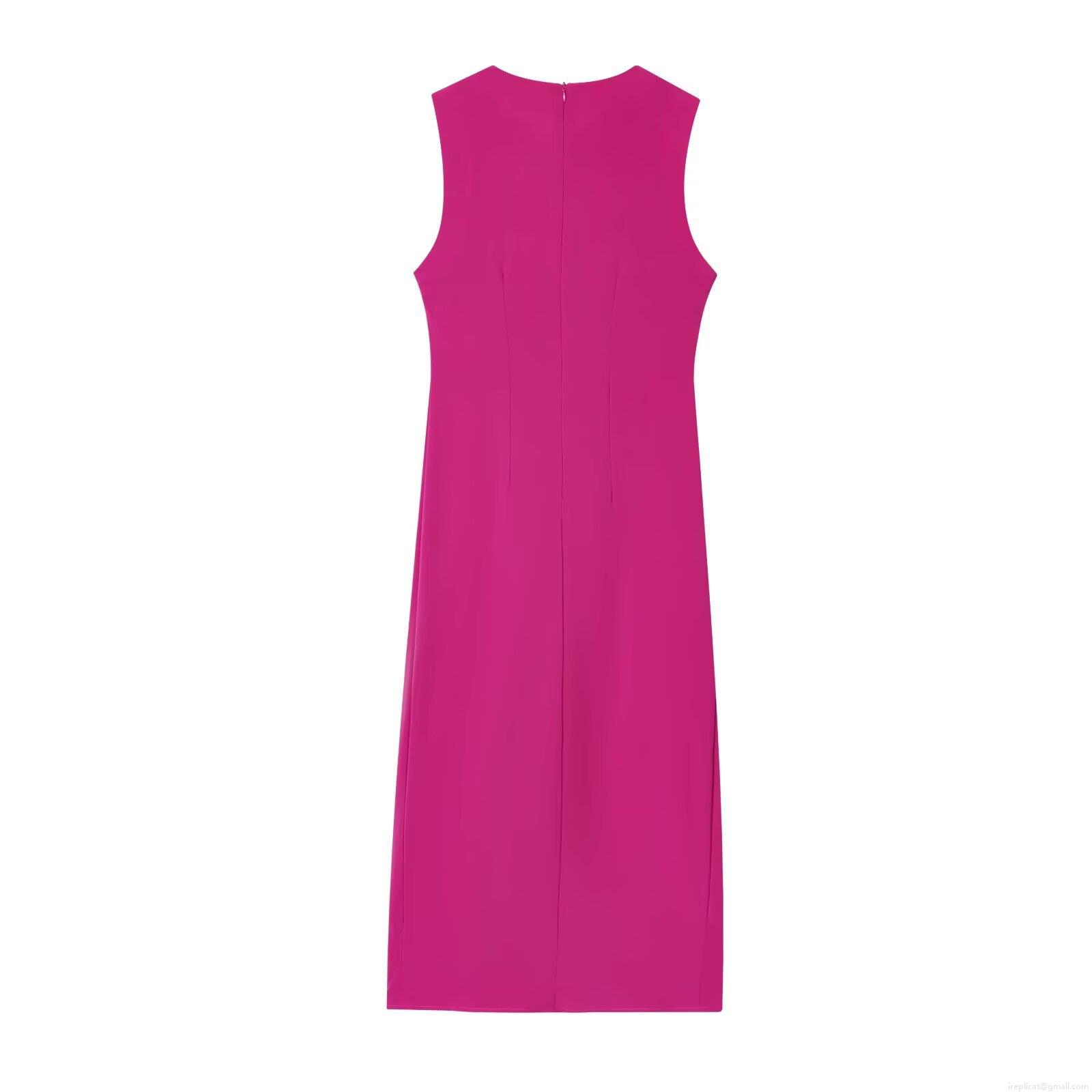 • Women's Elegant Rose Red Sleeveless Midi Dress With Metal Buckle Pleated Side Split Slim Fit Polyester Pullover Dress for Summer Office Party