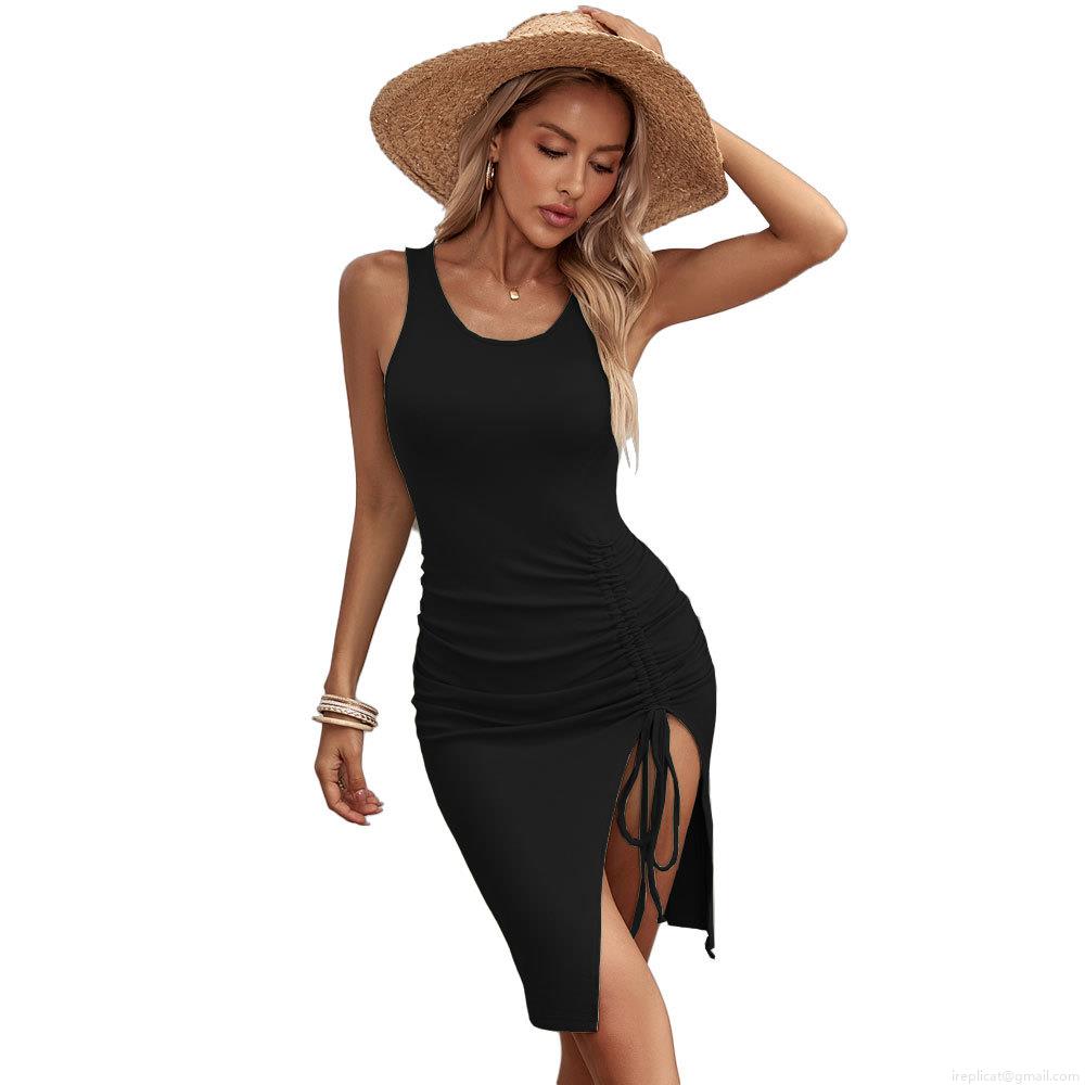 • Women's Elegant Ruched Drawstring Side Split Bodycon Dress Sleeveless Round Neck Viscose Spandex Midi Dress For Summer Vacation Party