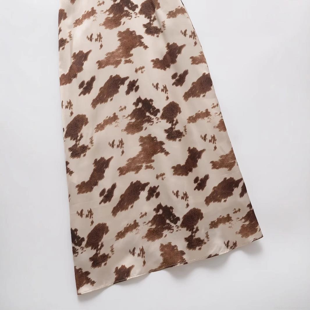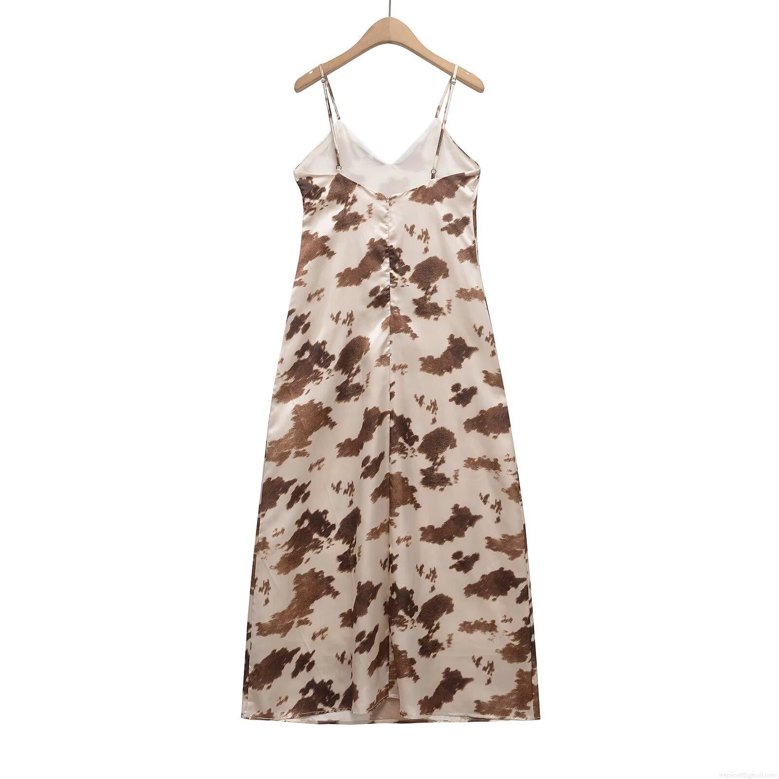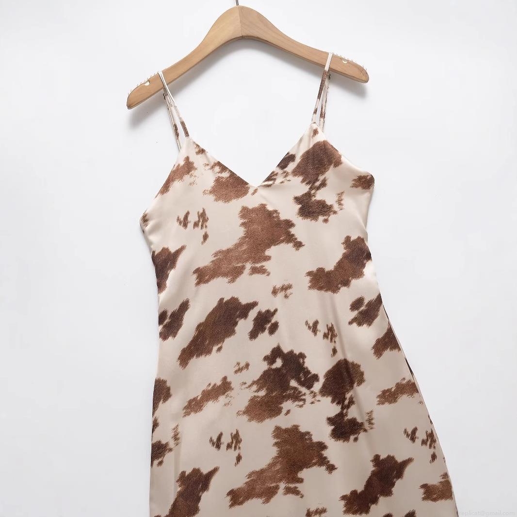 • Women's Elegant Satin Cow Print Slip Midi Dress V Neck Adjustable Spaghetti Strap Sexy Backless Party Long Dress Streetwear