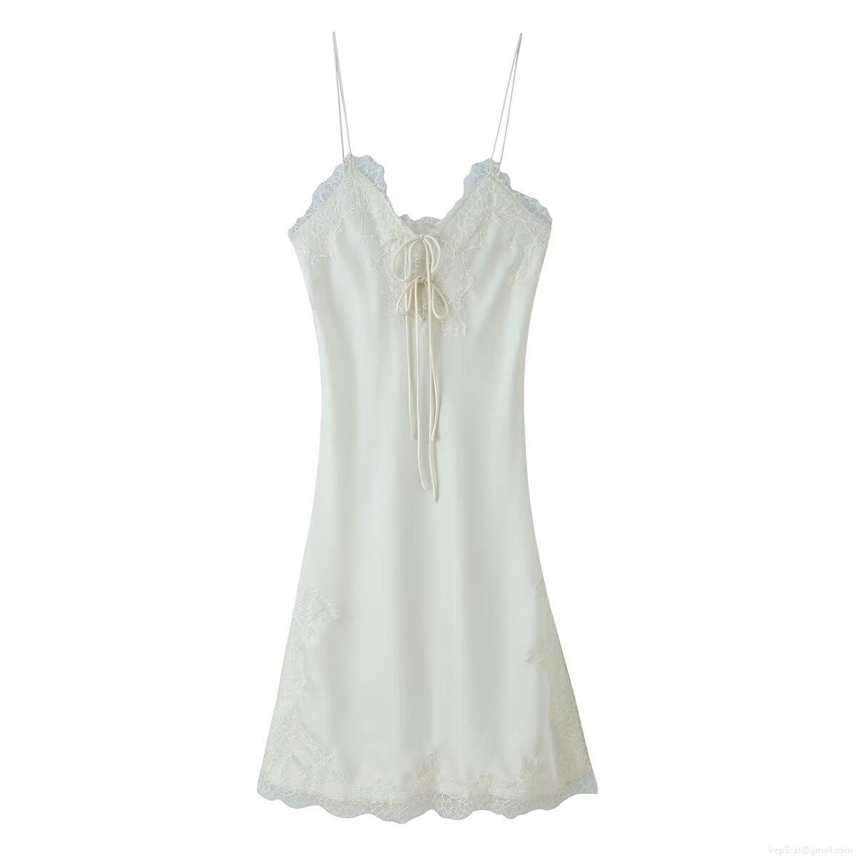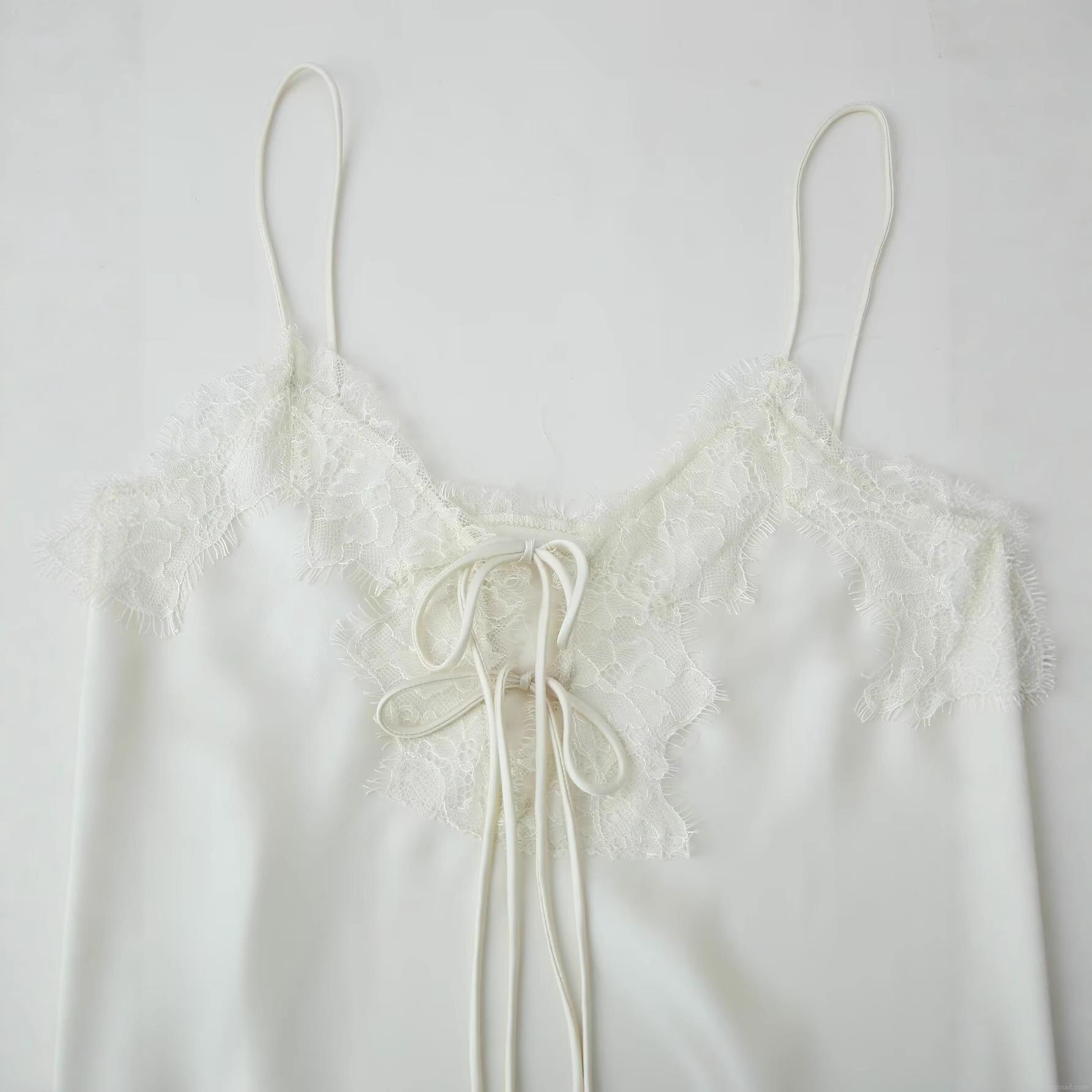 • Women's Elegant Satin Lace Cami Midi Dress Sexy Deep V-Neck Lace Trim Tie Front Spaghetti Strap Evening Party Wedding Guest Gown For Ladies