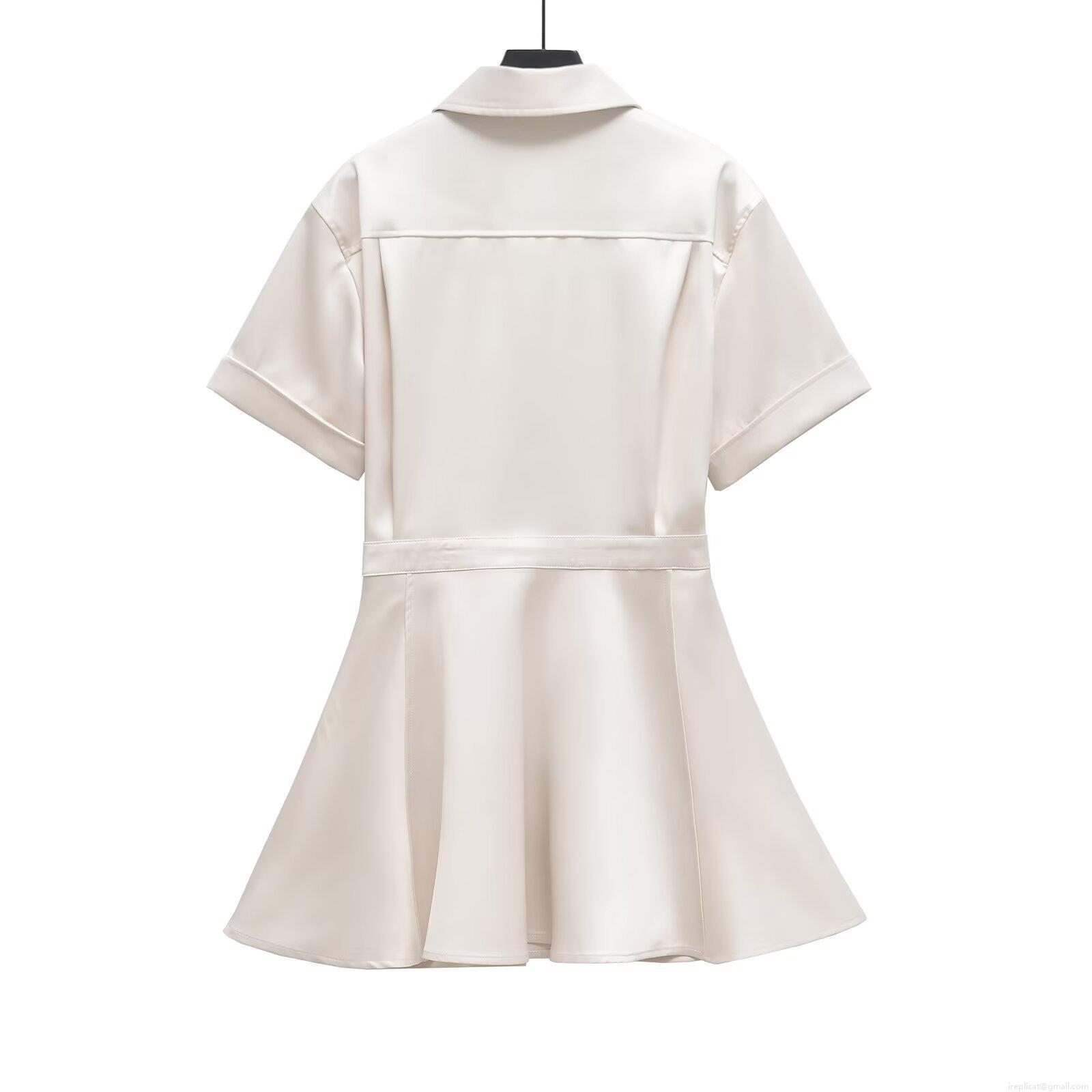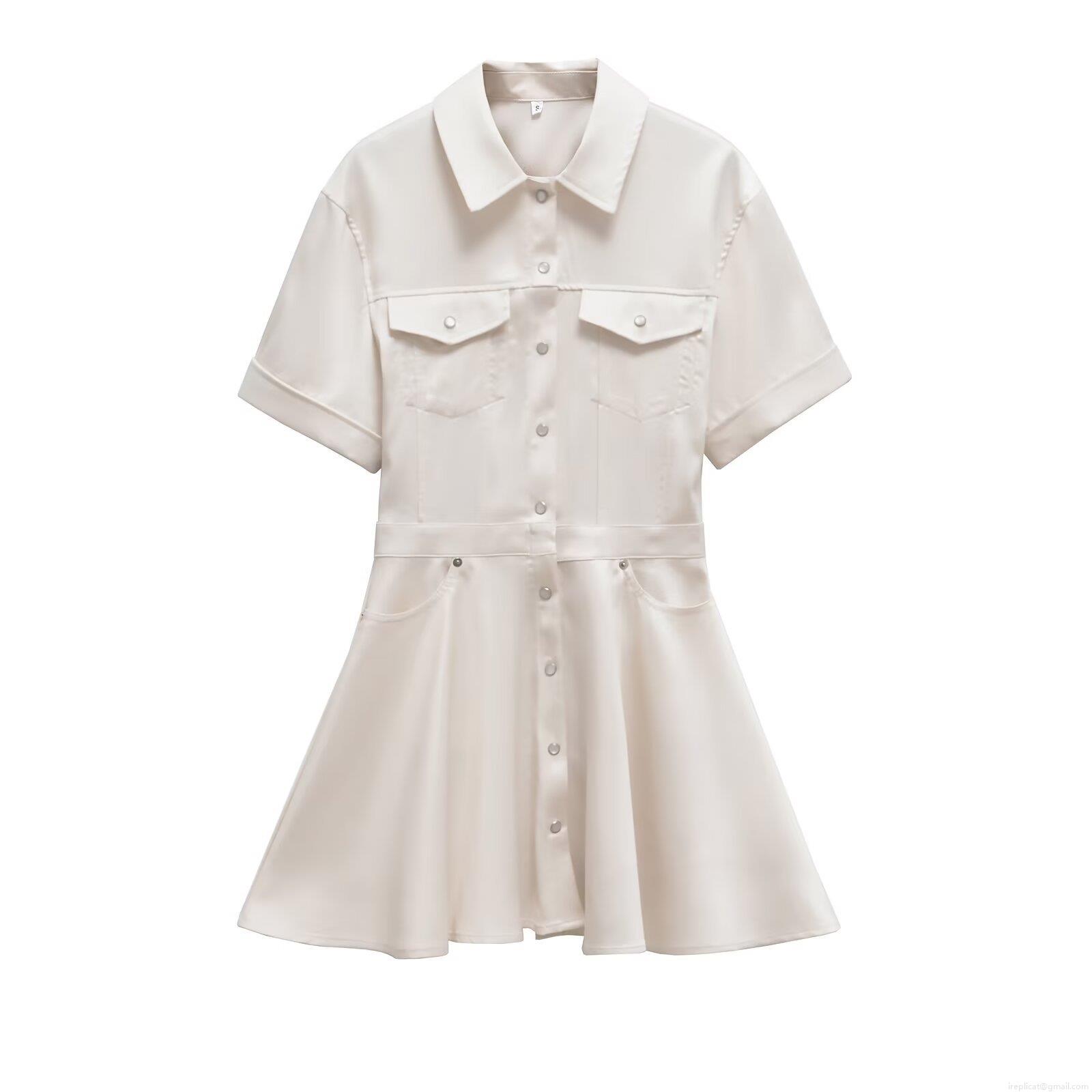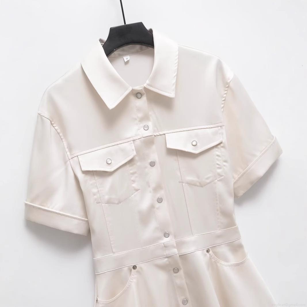Women's Elegant Satin Lapel Short Sleeve Midi Dress Button Down A-Line Shirt Dress With Double Pockets Office Lady Cargo Style Solid Ivory White Dress