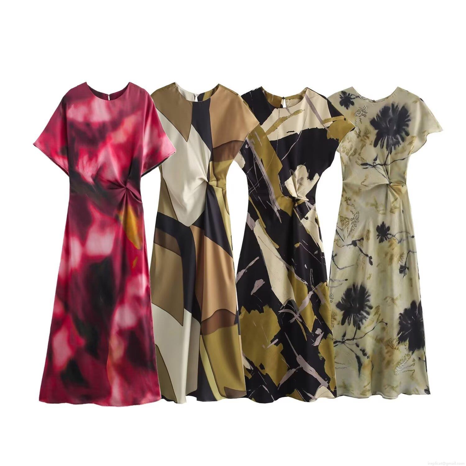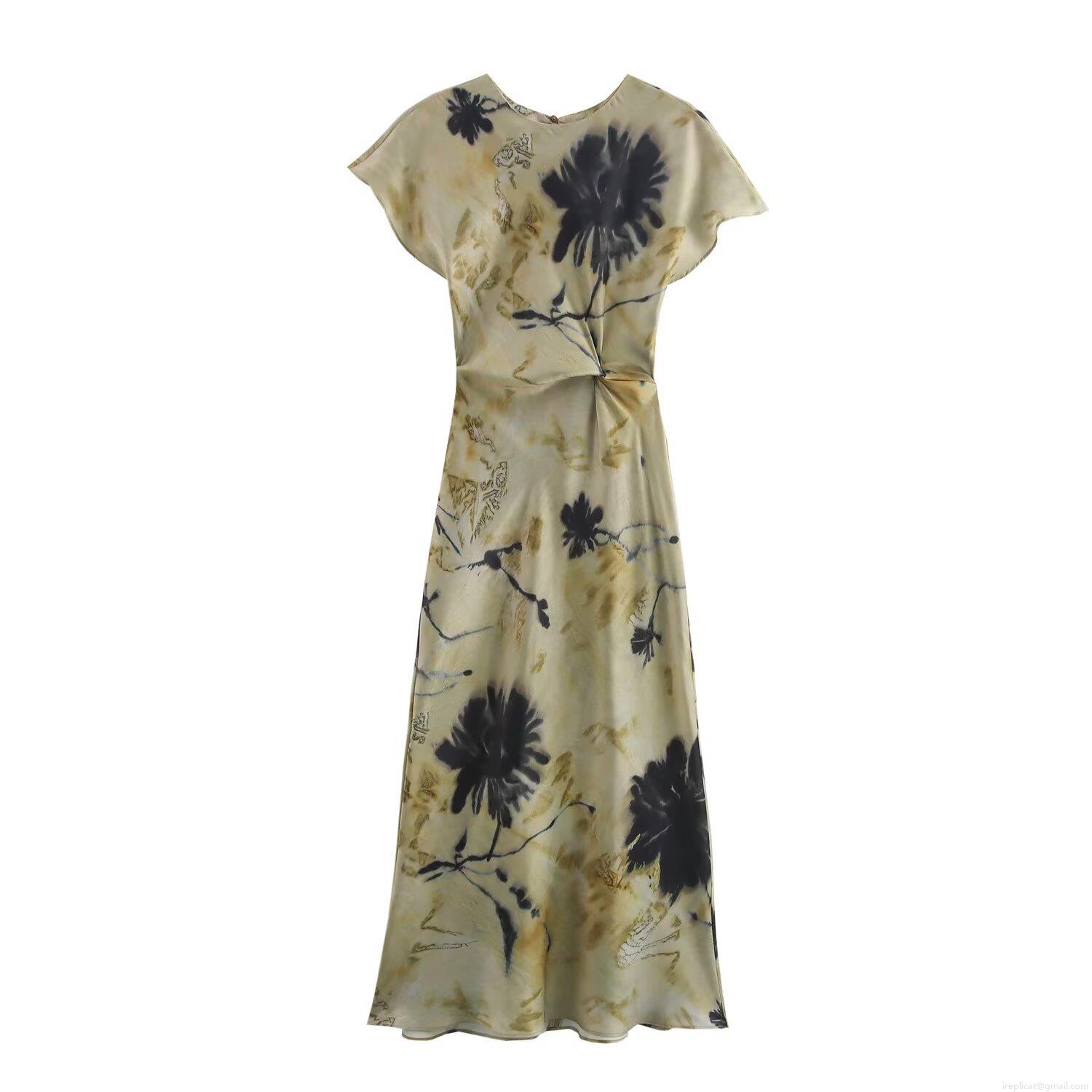 • Women's Elegant Satin Midi Dress Abstract Floral Print Twist Waist Crew Neck Cap Sleeve Silky Party Dress For Women Summer Fashion Streetwear