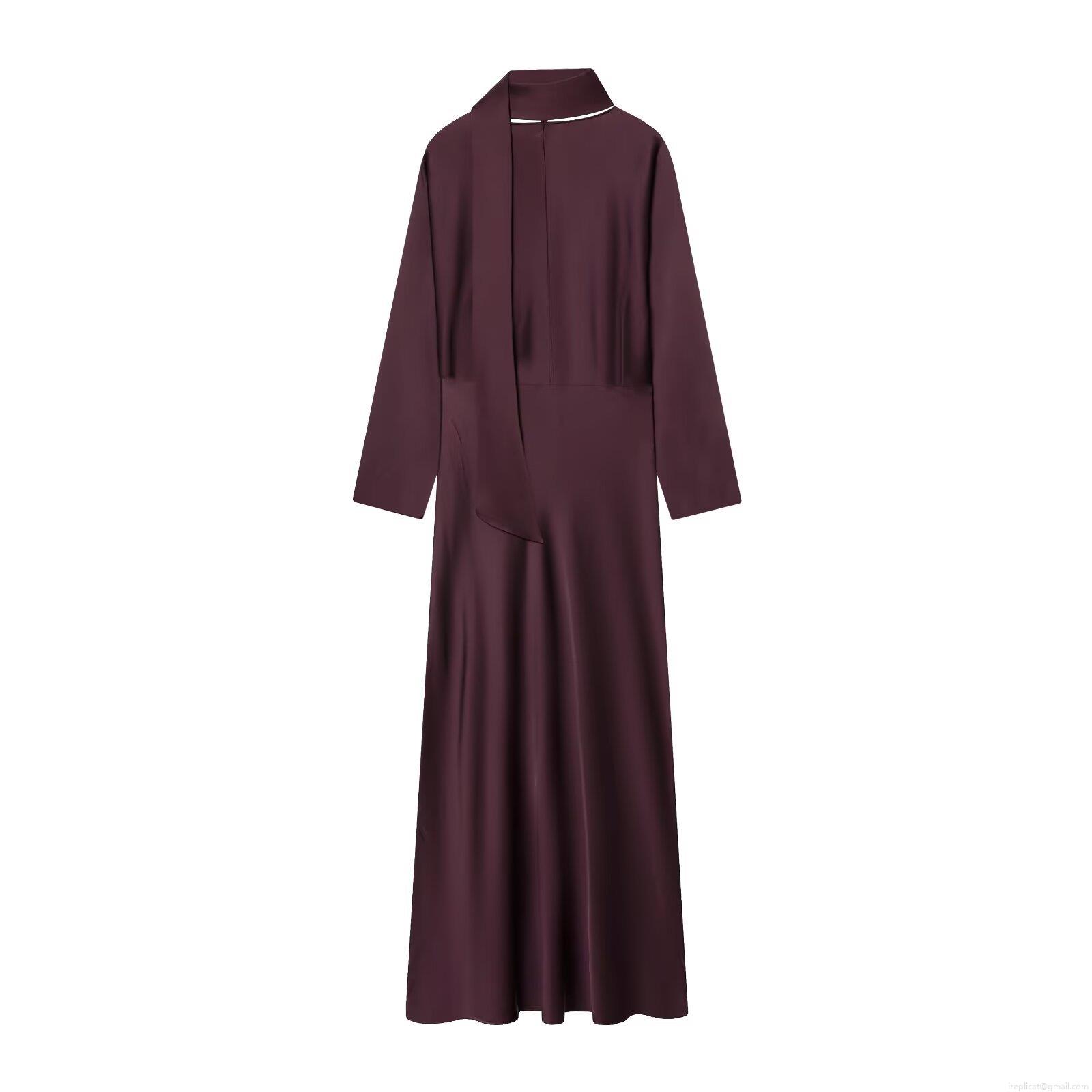 • Women's Elegant Satin Silk-Like Midi Dress With Scarf Tie V-Neck Long Sleeve Slim Fit A-Line Solid Color Evening Party Gown Lady Dresses