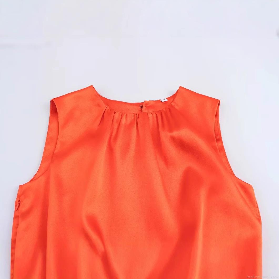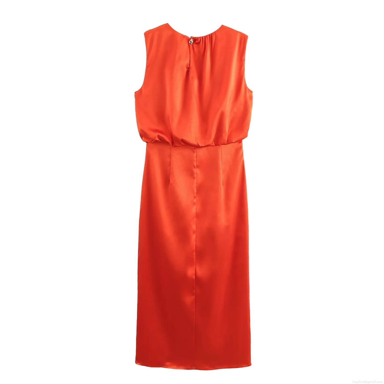 • Women's Elegant Satin Sleeveless Maxi Dress With Pleated Detail And High Slit Solid Color Round Neck Midi Dress For Banquet Party Night Out