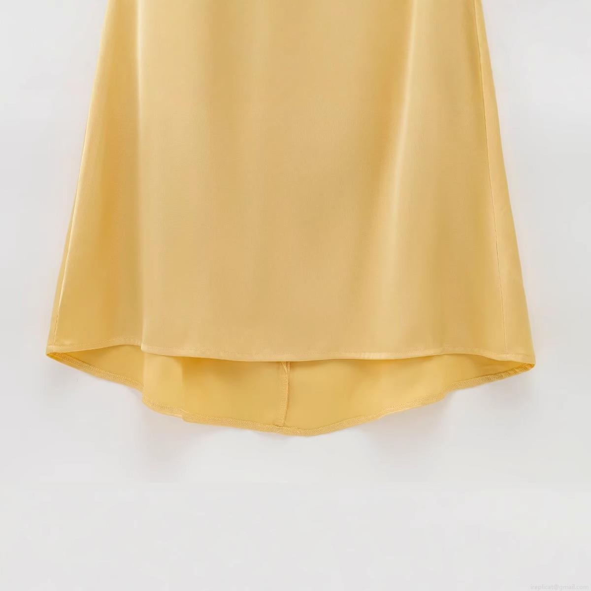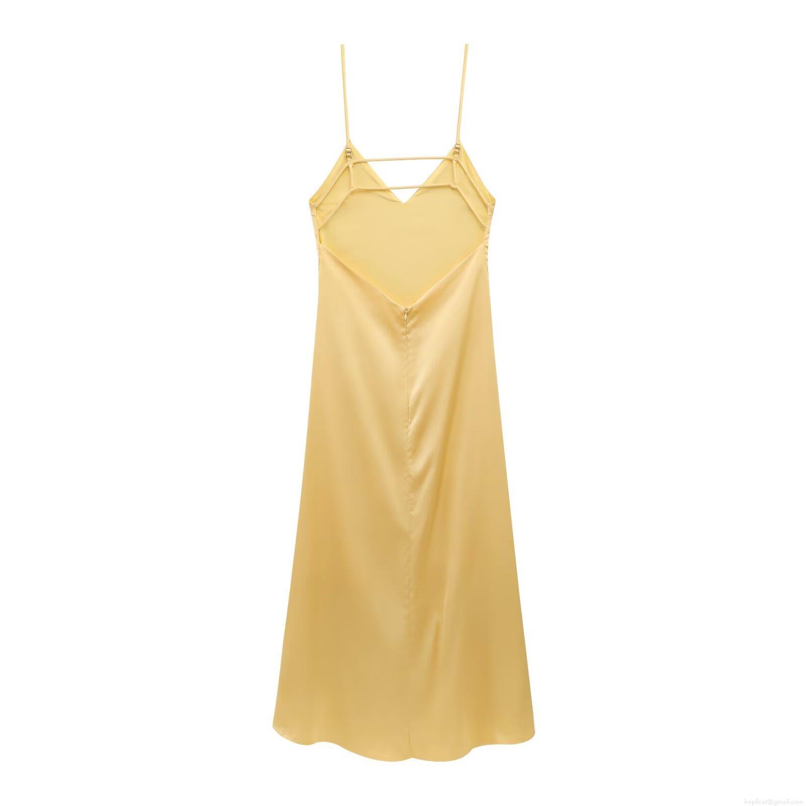 • Women's Elegant Satin V-Neck Backless Cami Midi Dress Solid Yellow Polyester Sexy Evening Party Clubwear Slip Dresses For Women