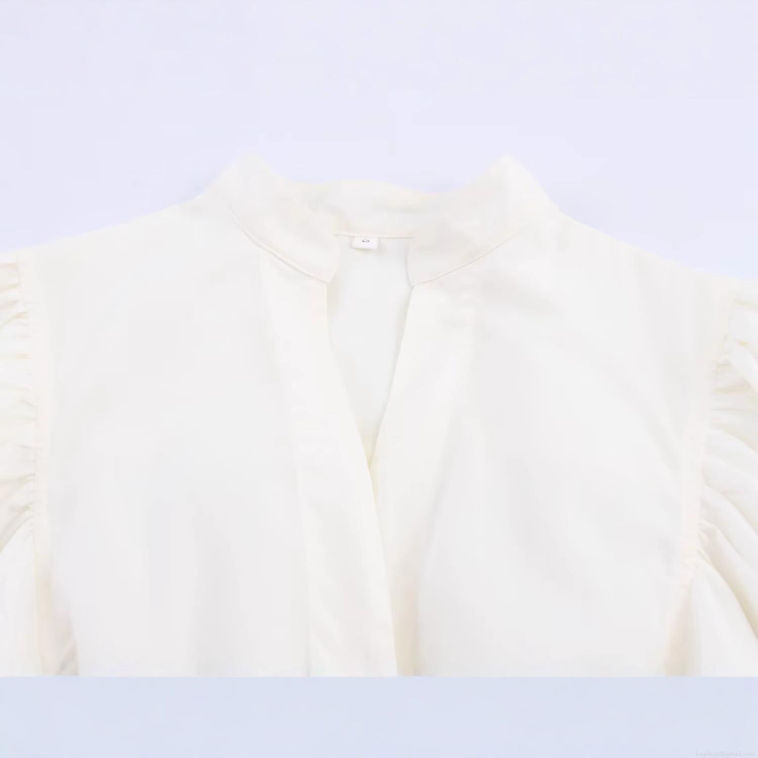 • Women's Elegant Satin V-Neck Shirt Dress With Puff Long Lantern Sleeves And Tie Waist Solid Color White Midi Maxi Dress For Party Office
