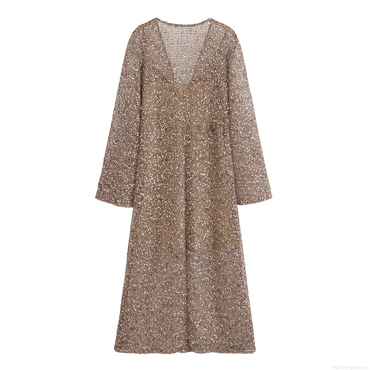 • Women's Elegant Sequin Mesh Midi Dress V-Neck Long Sleeve Sheer Sparkly Evening Cocktail Party Dress For Wedding Guest Solid Camel Gold Partywear
