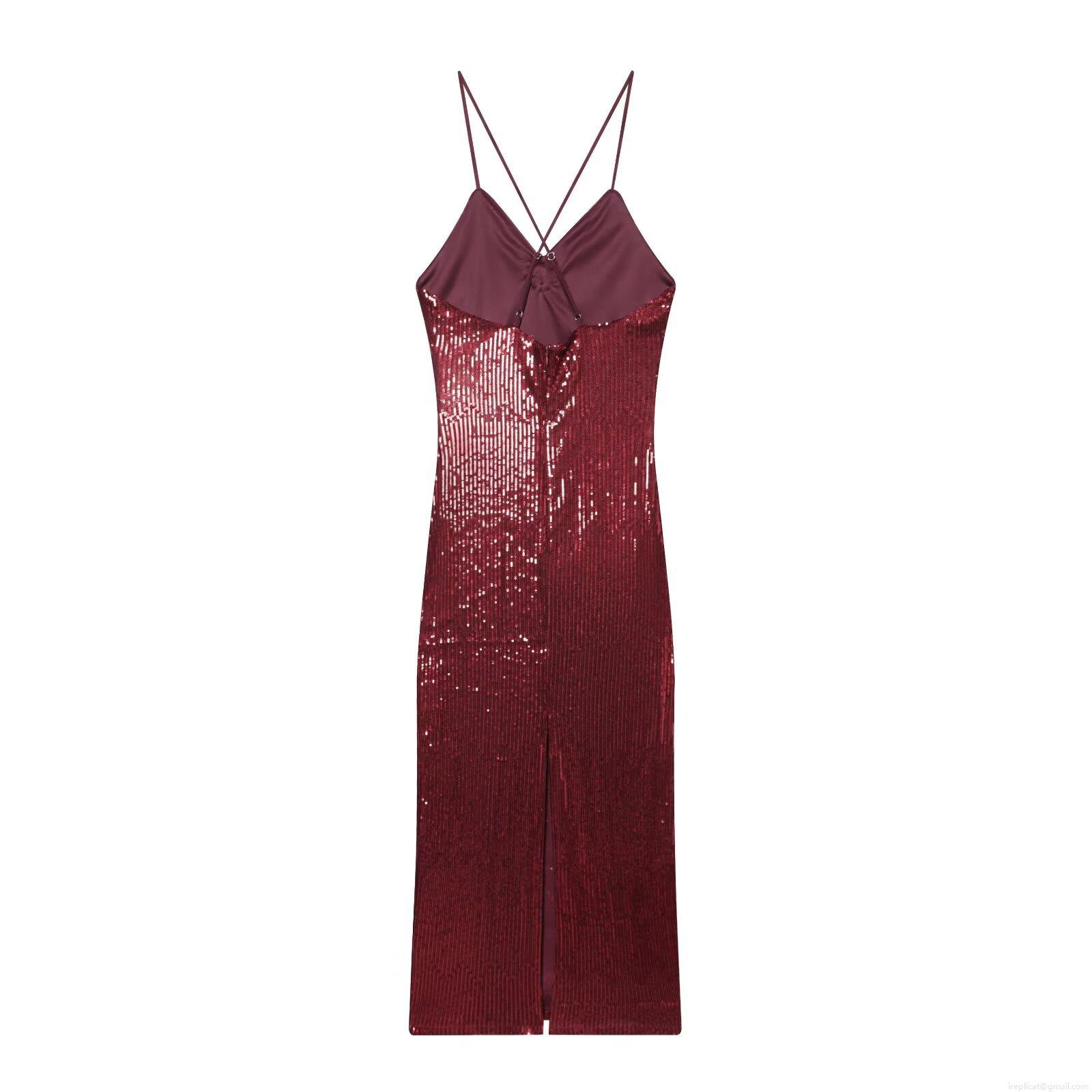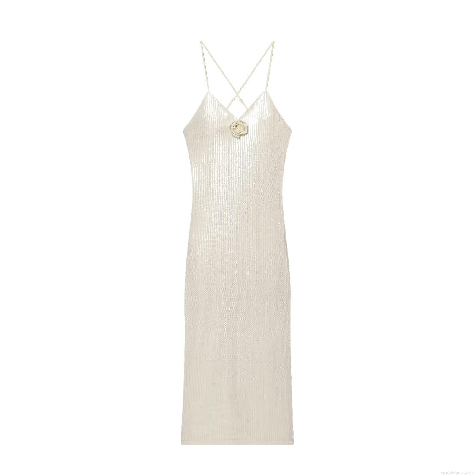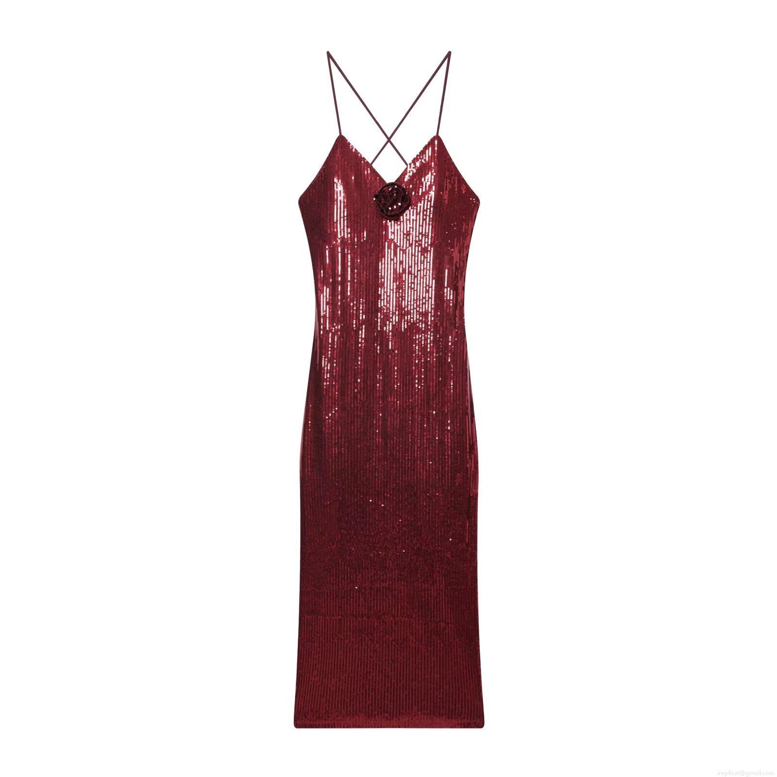 • Women's Elegant Sequin Spaghetti Strap Dress With 3D Flower Decoration Deep V-Neck Criss-Cross Backless Sexy Midi Party Dress For Women Evening Banquet Social Events
