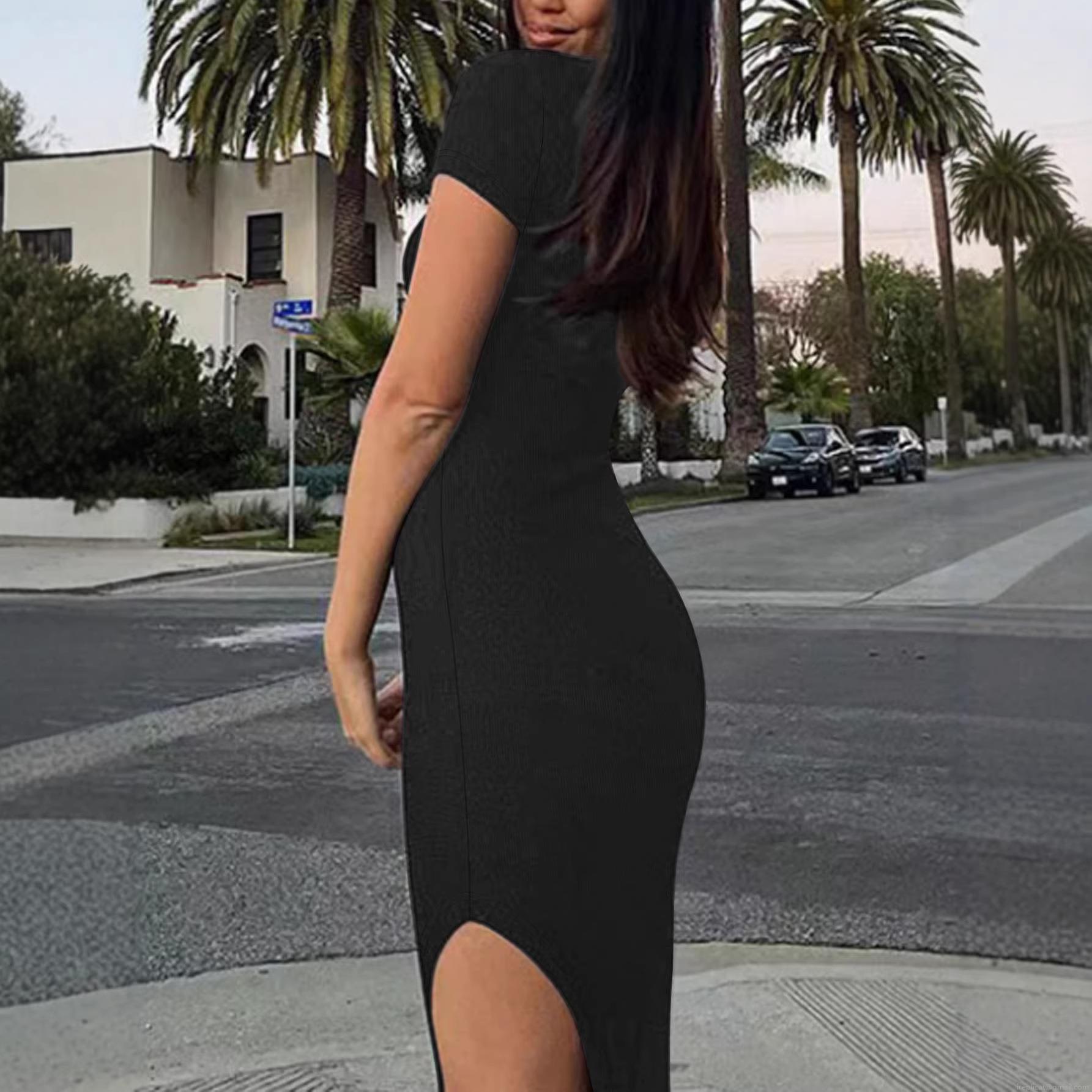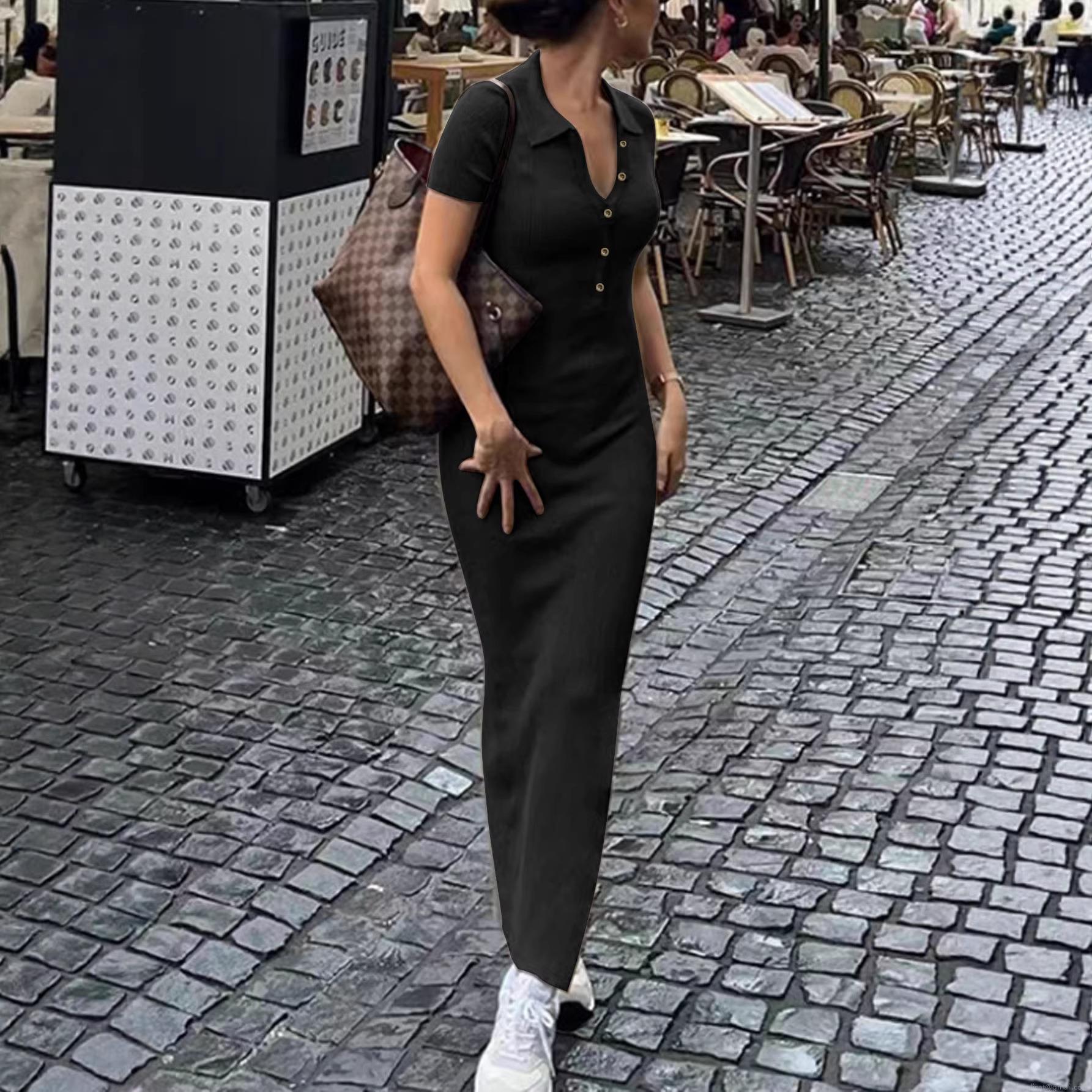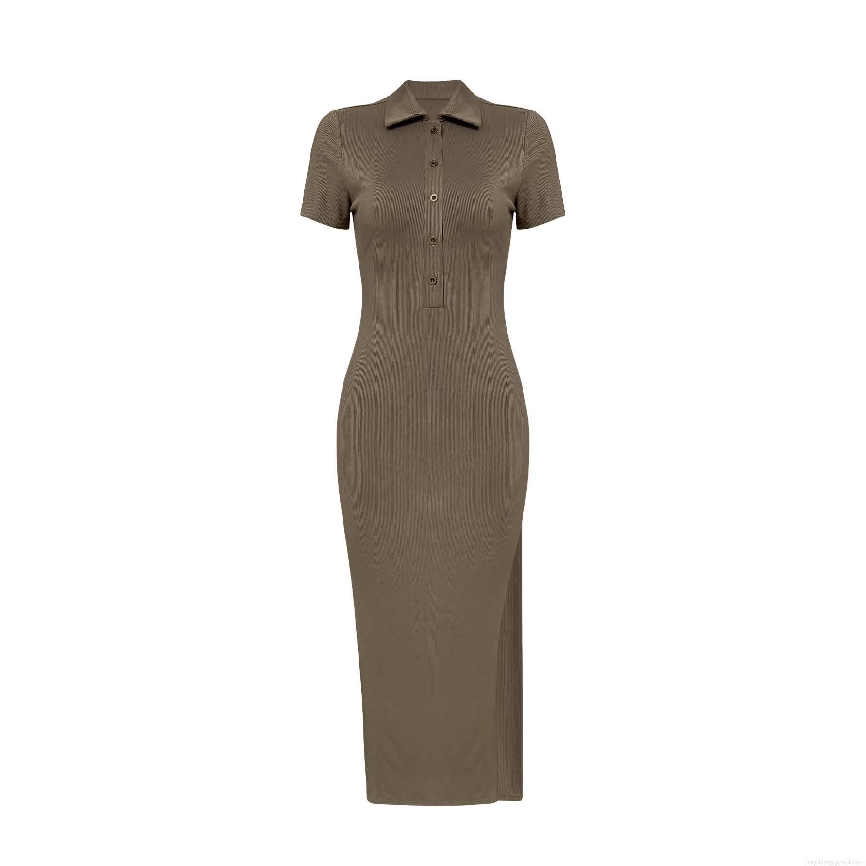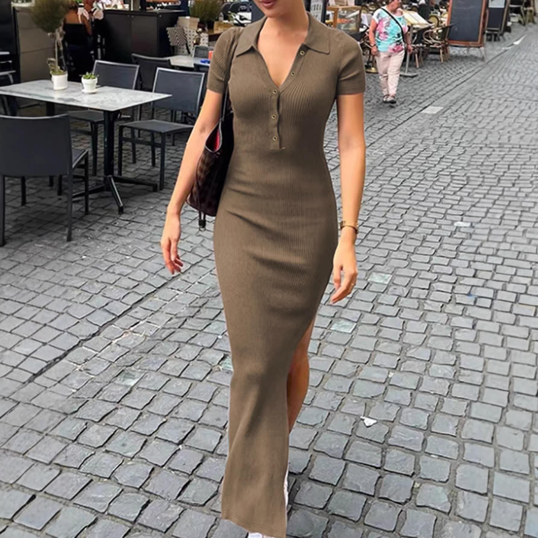 • Women's Elegant Short Sleeve Ribbed Knit Polo Midi Dress Slim Fit Sexy Side Slit Single Breasted Bodycon Dress for Daily Casual Streetwear