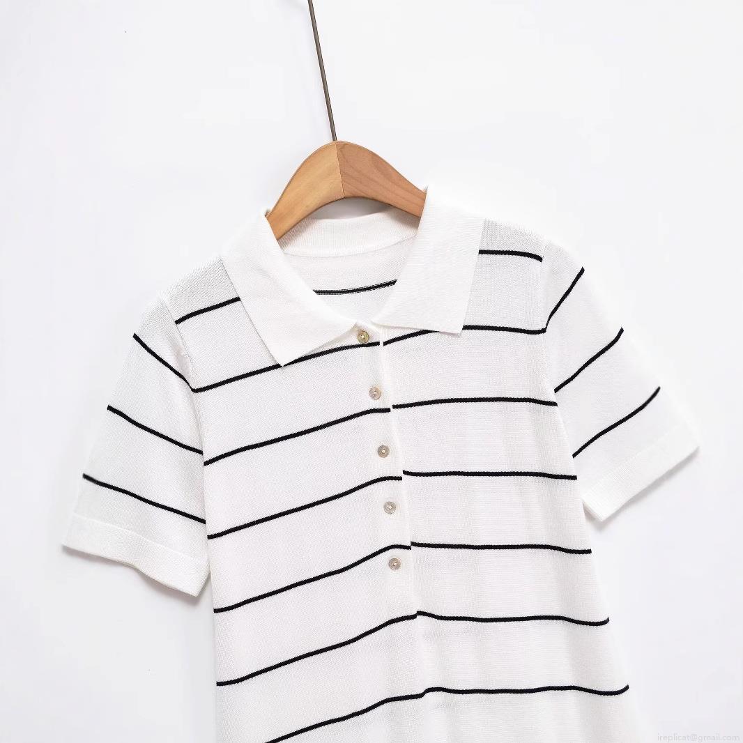 Stripe, Polo Collar, Button Decoration