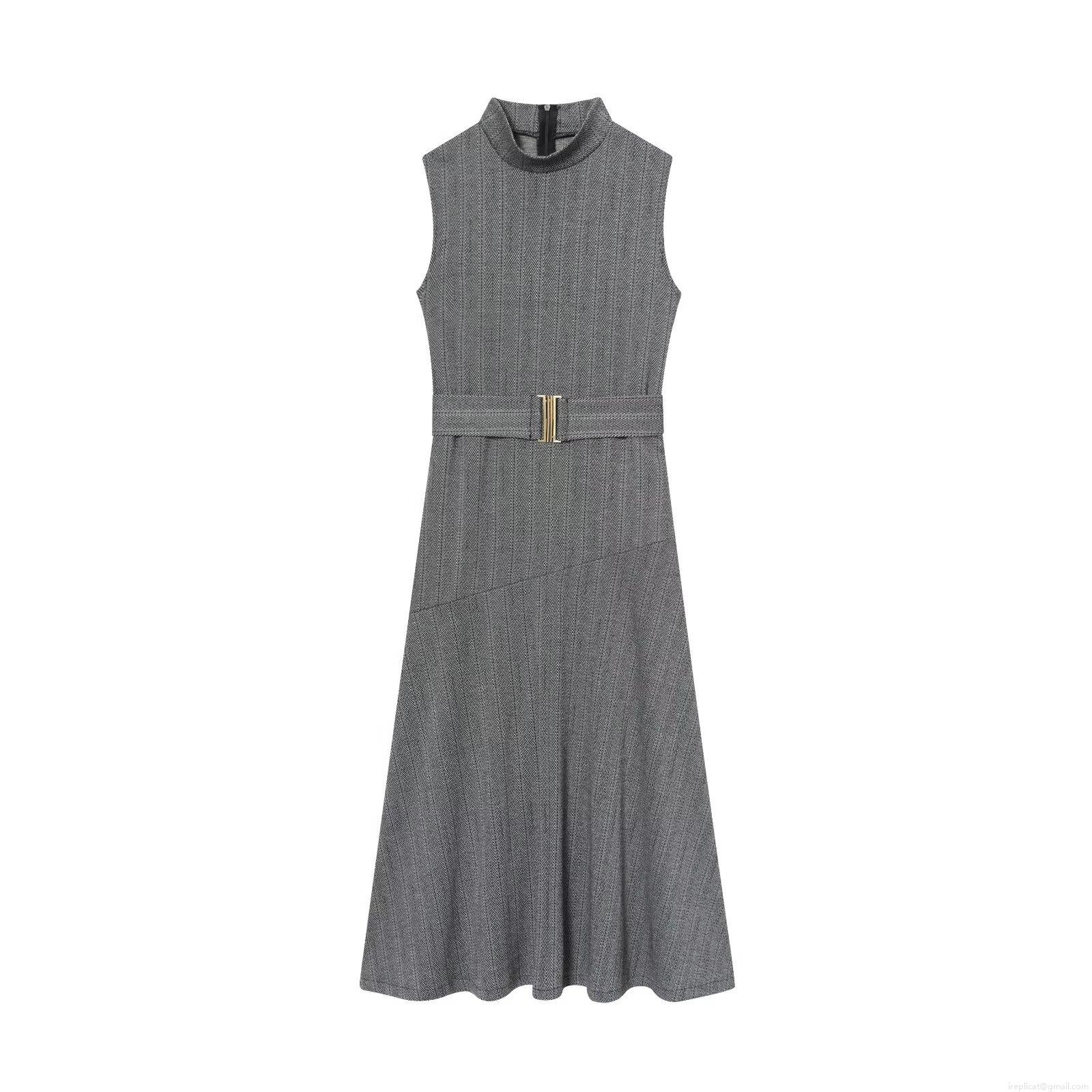 Women's Elegant Sleeveless Herringbone Midi Dress With Belt Semi High Neck Back Zipper Polyester Office Business Sheath Dress