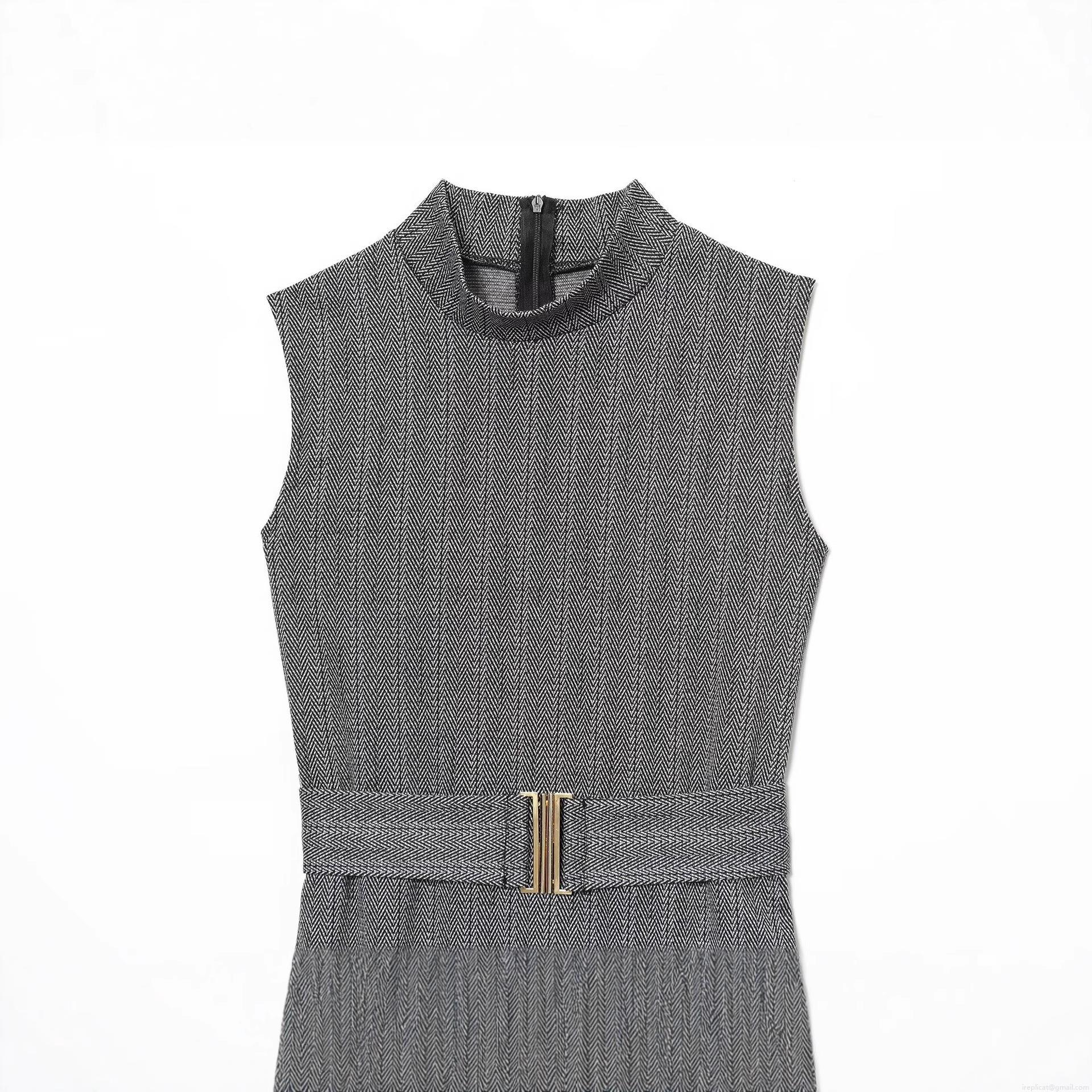 • Women's Elegant Sleeveless Herringbone Midi Dress With Belt Semi High Neck Back Zipper Polyester Office Business Sheath Dress