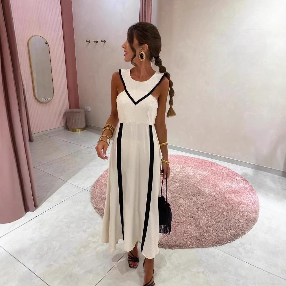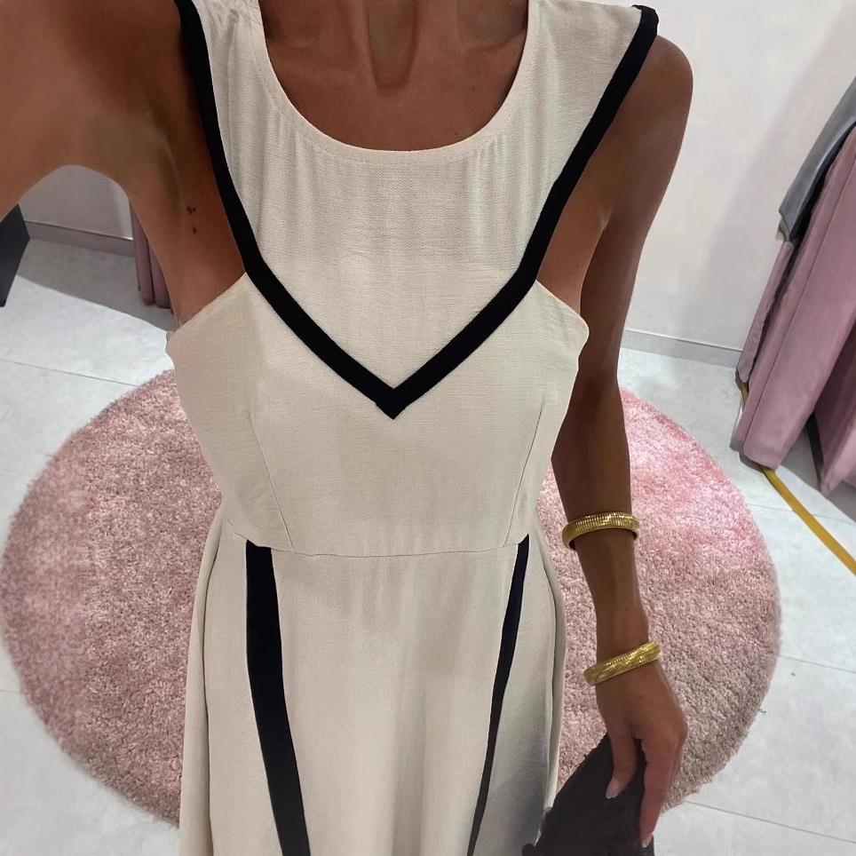 Women's Elegant Sleeveless Midi Dress Contrast Color Black Trim Bodycon Dress V-Back Minimalist High Waist Summer Dress For Casual Party Office Wear