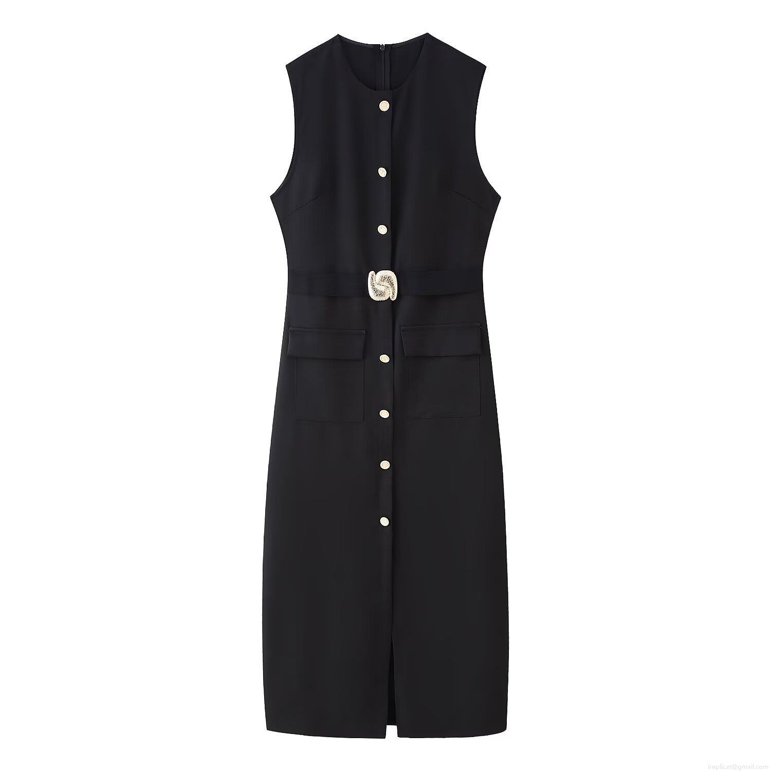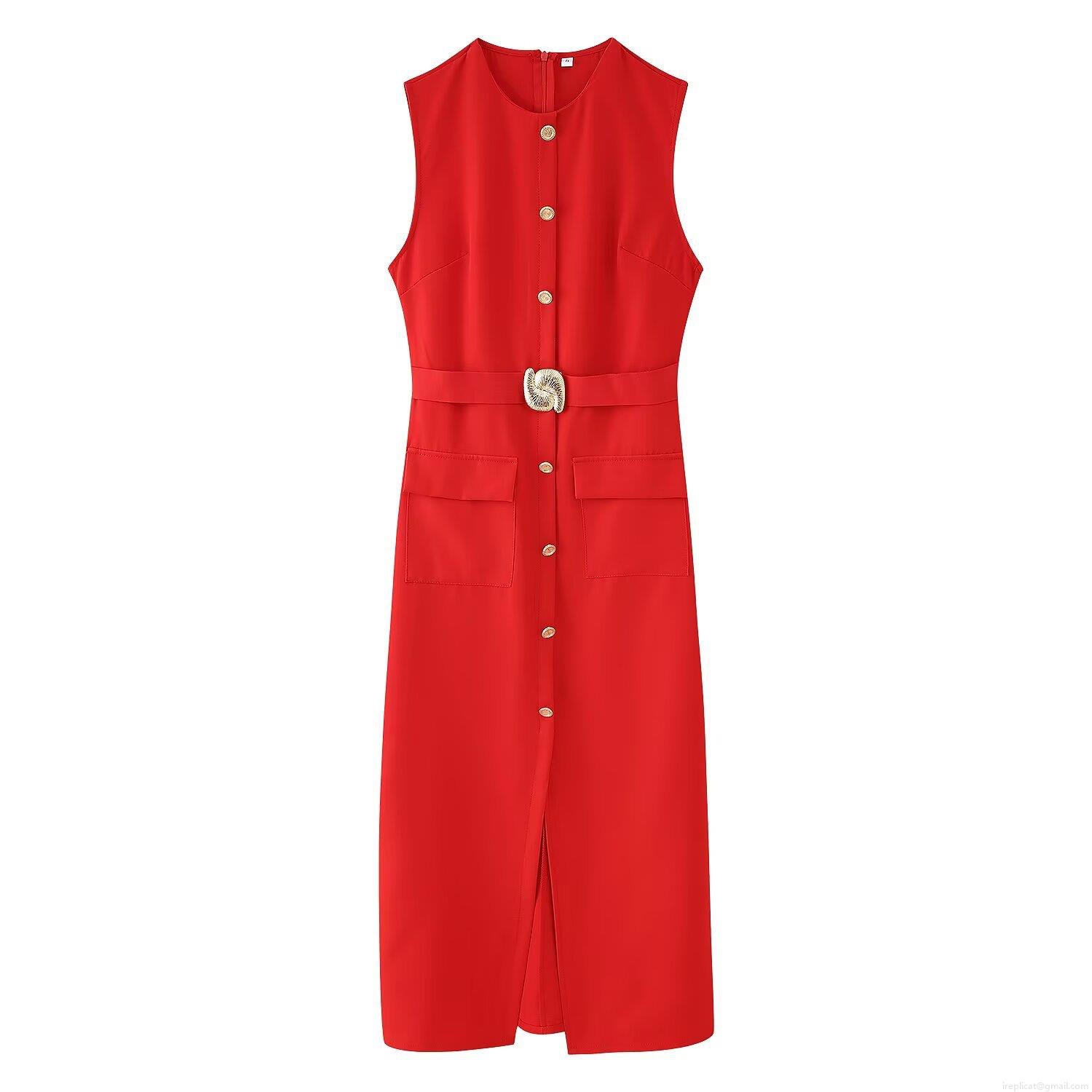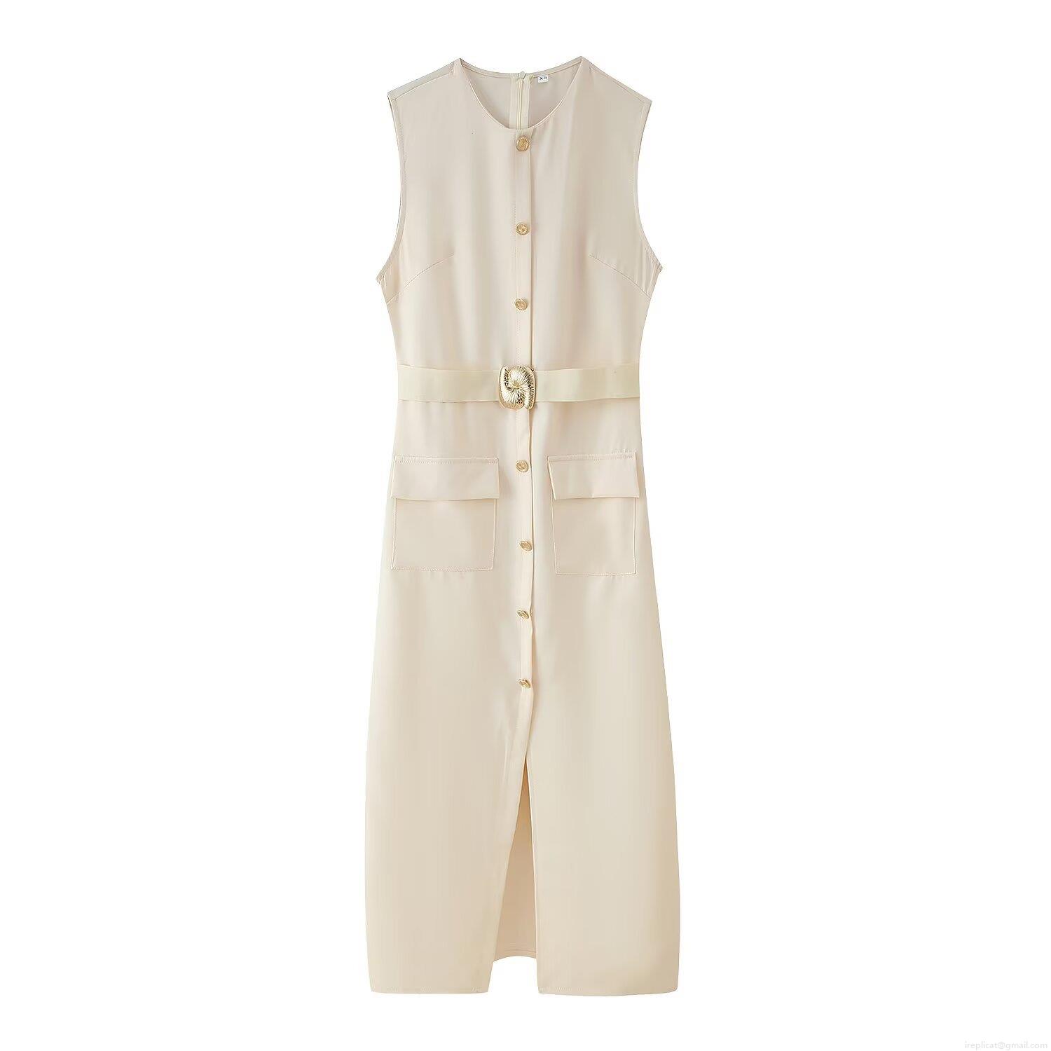 Women's Elegant Sleeveless Midi Dress Round Neck Single Breasted Polyester With Belt Pockets Slit For Office Casual Summer Street Modern Minimalist Style