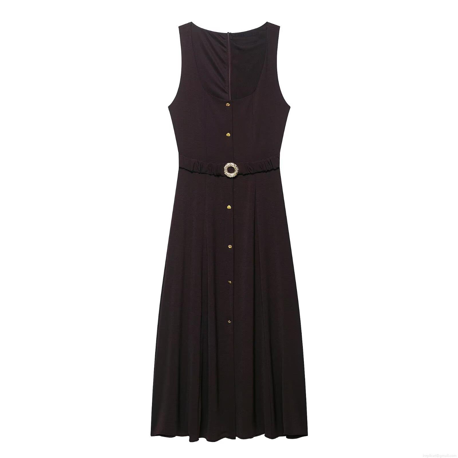 • Women's Elegant Sleeveless Square Neck Midi Dress With Belt Single Breasted Button Decoration Polyester Slim Fit A-Line Dress For Office Party Daily Wear