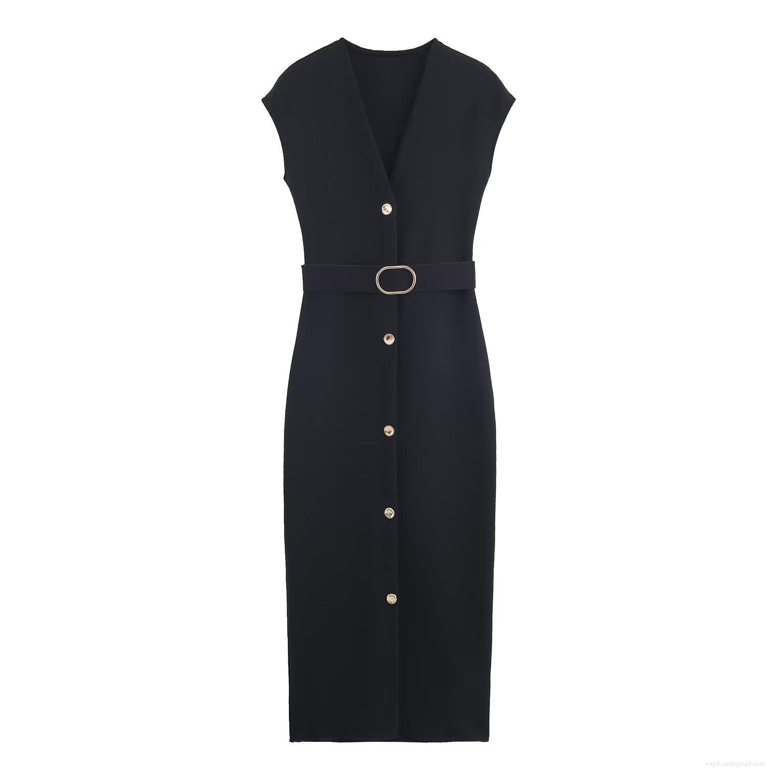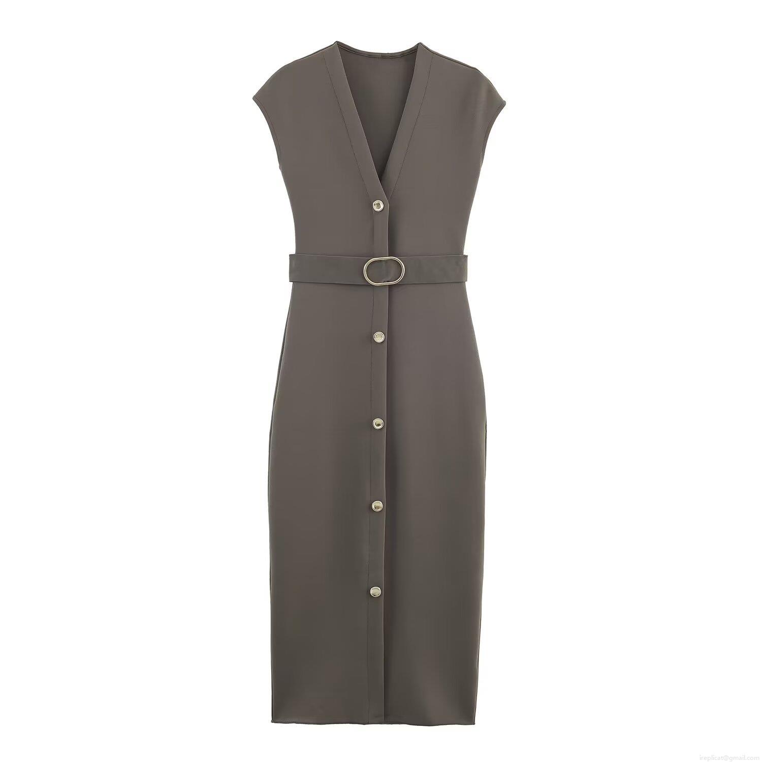 • Women's Elegant Sleeveless V-Neck Midi Dress With Belt Button Down Solid Color Polyester Blend For Casual Office Commute Dating Summer Fashion