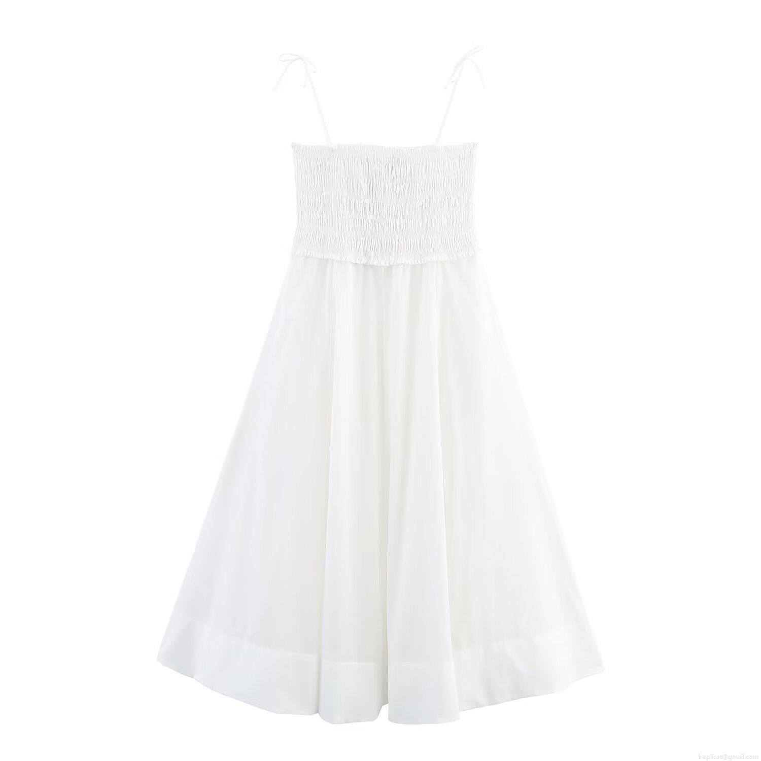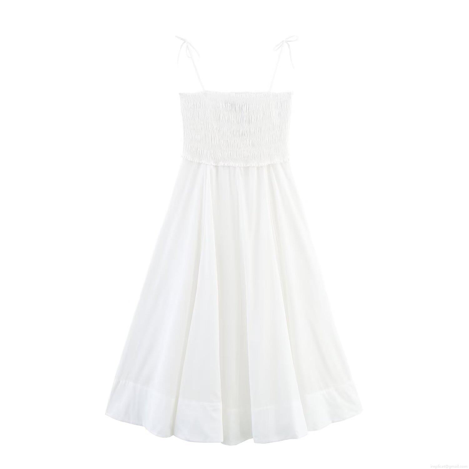 • Women's Elegant Smocked Poplin Midi Dress Sexy V-Neck Bow Spaghetti Strap A-Line Sundress Solid Color Sleeveless Summer Party Dress For Women