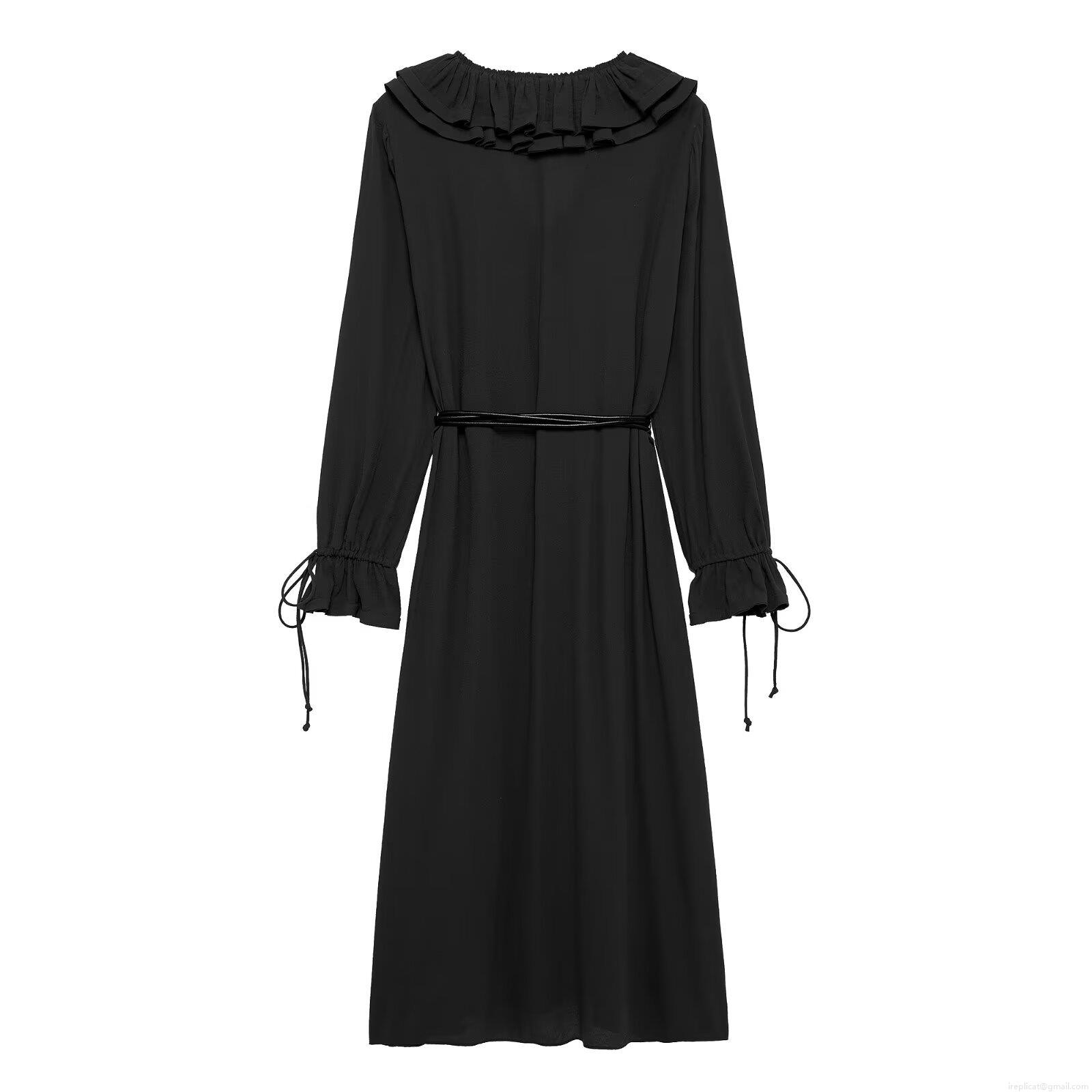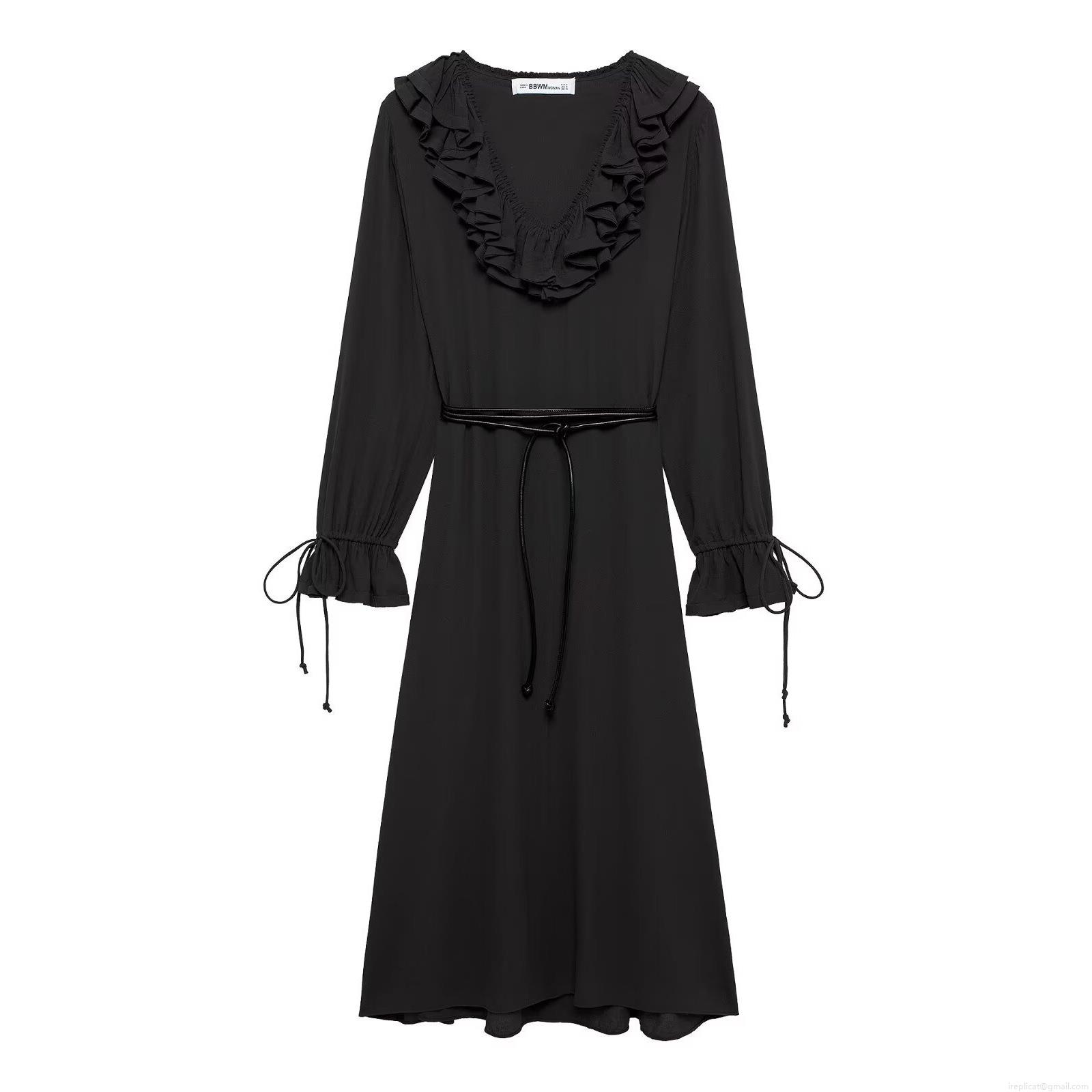 • Women's Elegant Solid Color V-Neck Ruffle Midi Dress 100% Polyester Long Sleeve A-Line Dress With Waist Tie And Drawstring Cuffs For Casual Party Streetwear