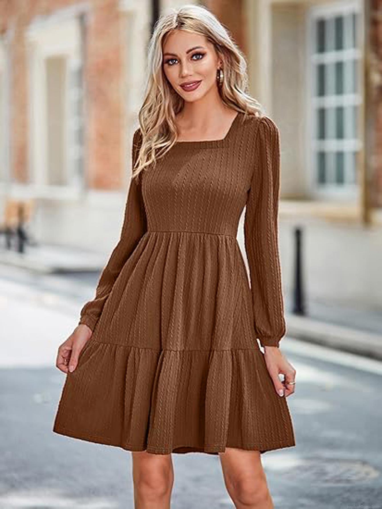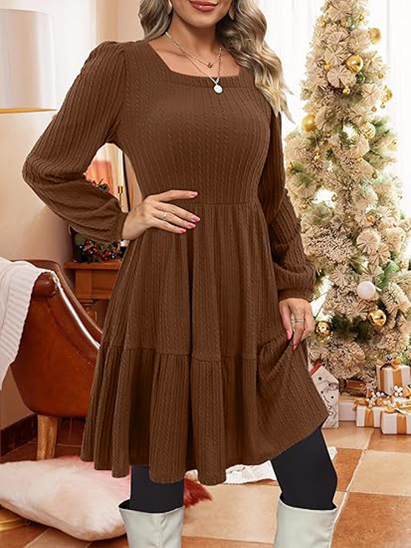 • Women's Elegant Square Neck Long Sleeve Knit Midi Dress Autumn Winter Solid Brown Tiered Pleated A-Line Sweater Dress For Commuting Office Ladies
