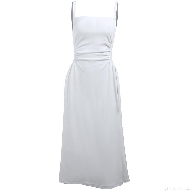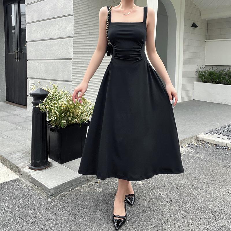 Solid Color, Square Collar, Thin Straps, Waist Pleats, A-shaped Arrangement