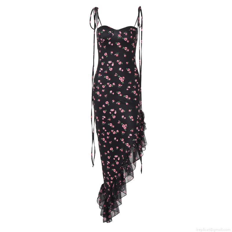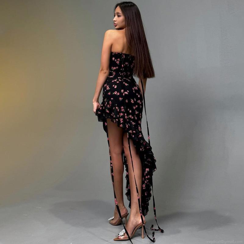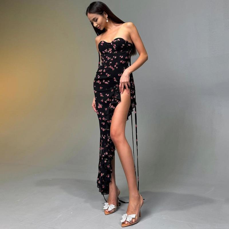 • Women's Elegant Strapless Floral Midi Dress Polyester Spandex Blend Ruffle Hem Asymmetric Lace-up Bodycon Dress For Summer Party Wedding Vacation