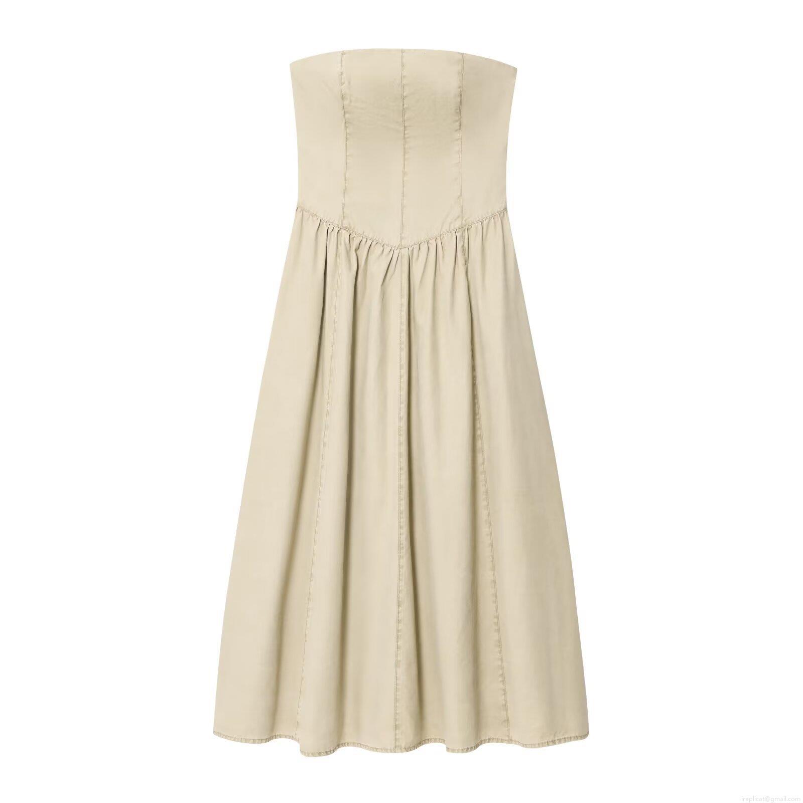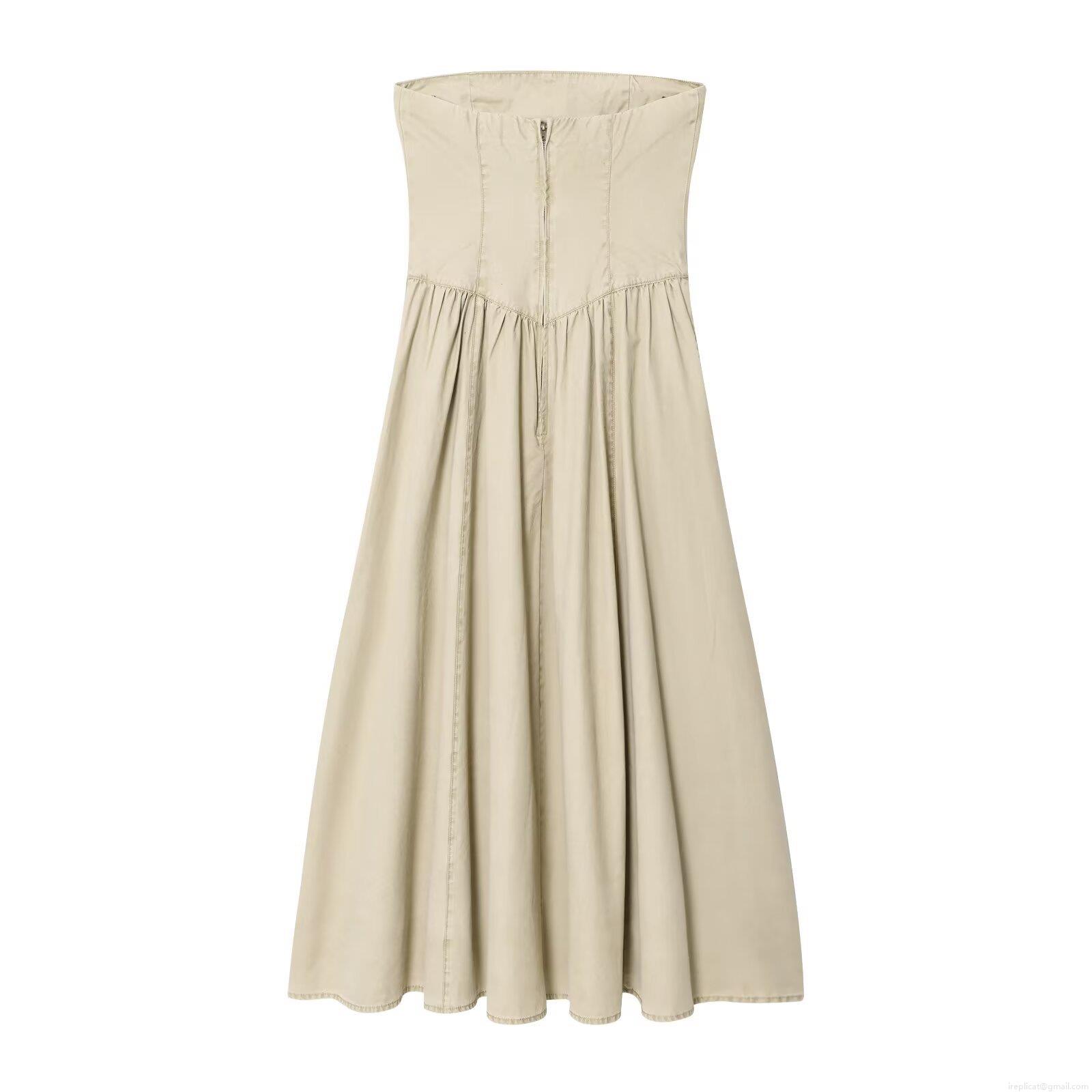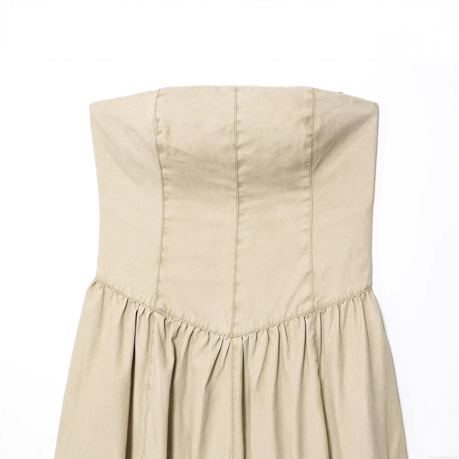• Women's Elegant Strapless High Waist Pleated Midi Dress Khaki Polyester Sexy A-Line Long Party Dress for Wedding Guest Evening Clubwear