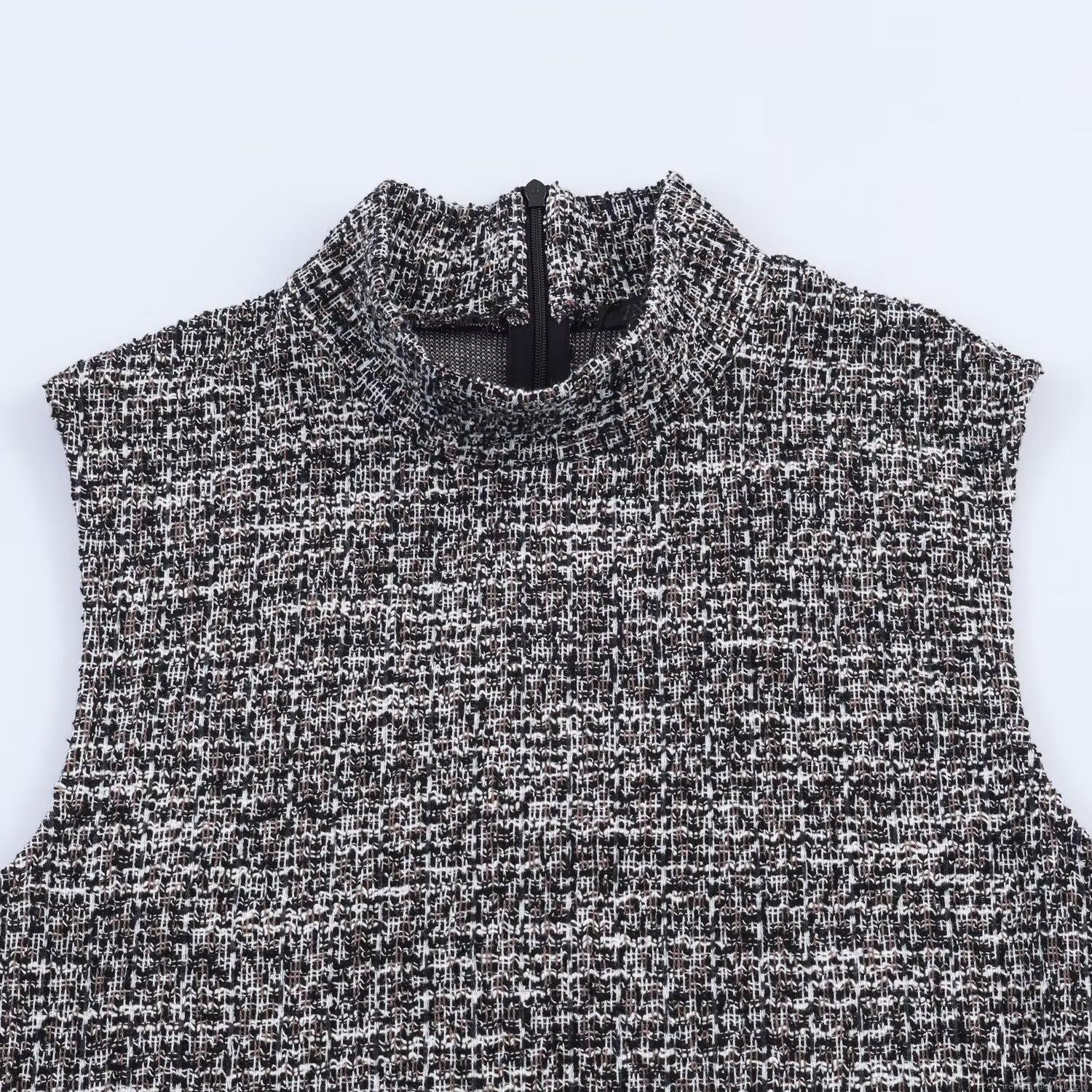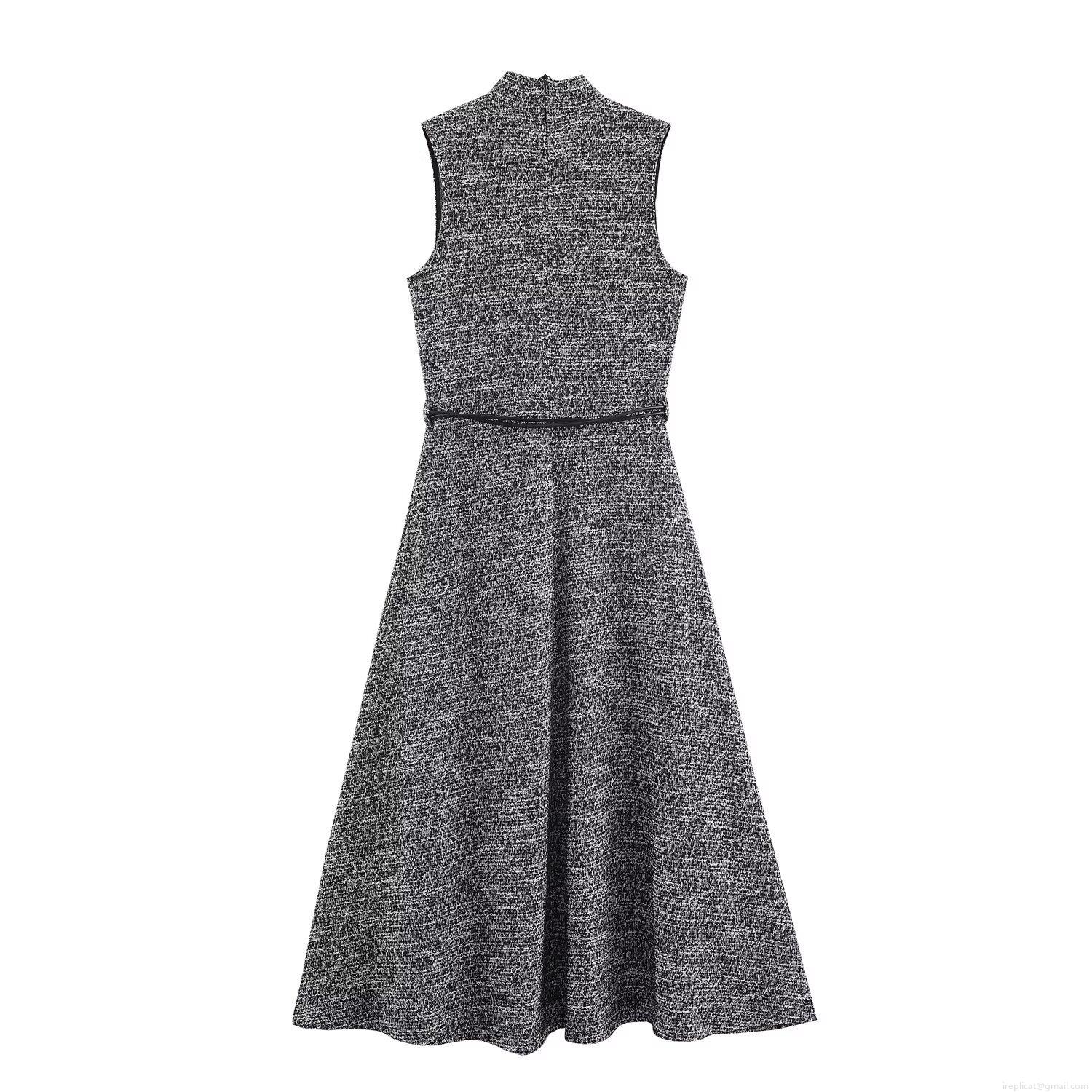 • Women's Elegant Tweed Sleeveless Midi Dress With Belt Stand Collar Slim Fit Polyester Blend A-Line Dress For Office Party Casual Winter Fashion