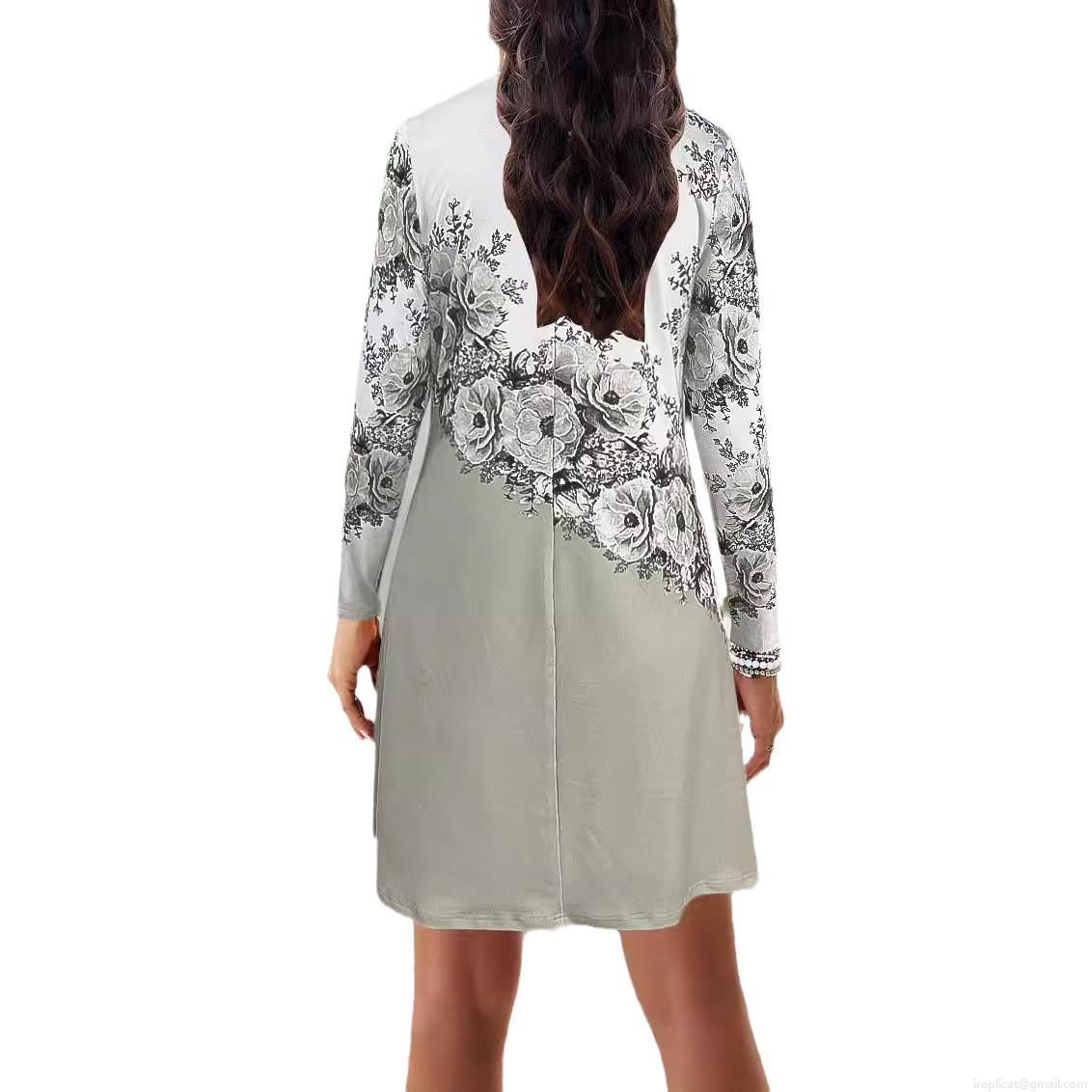 • Women's Elegant V Neck Long Sleeve Floral Print Patchwork Midi Dress Autumn Winter Casual Color Block A-Line Dresses for Women