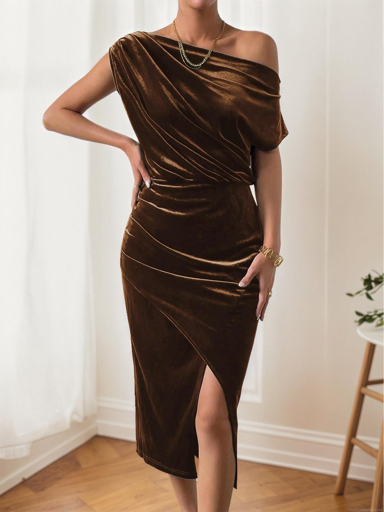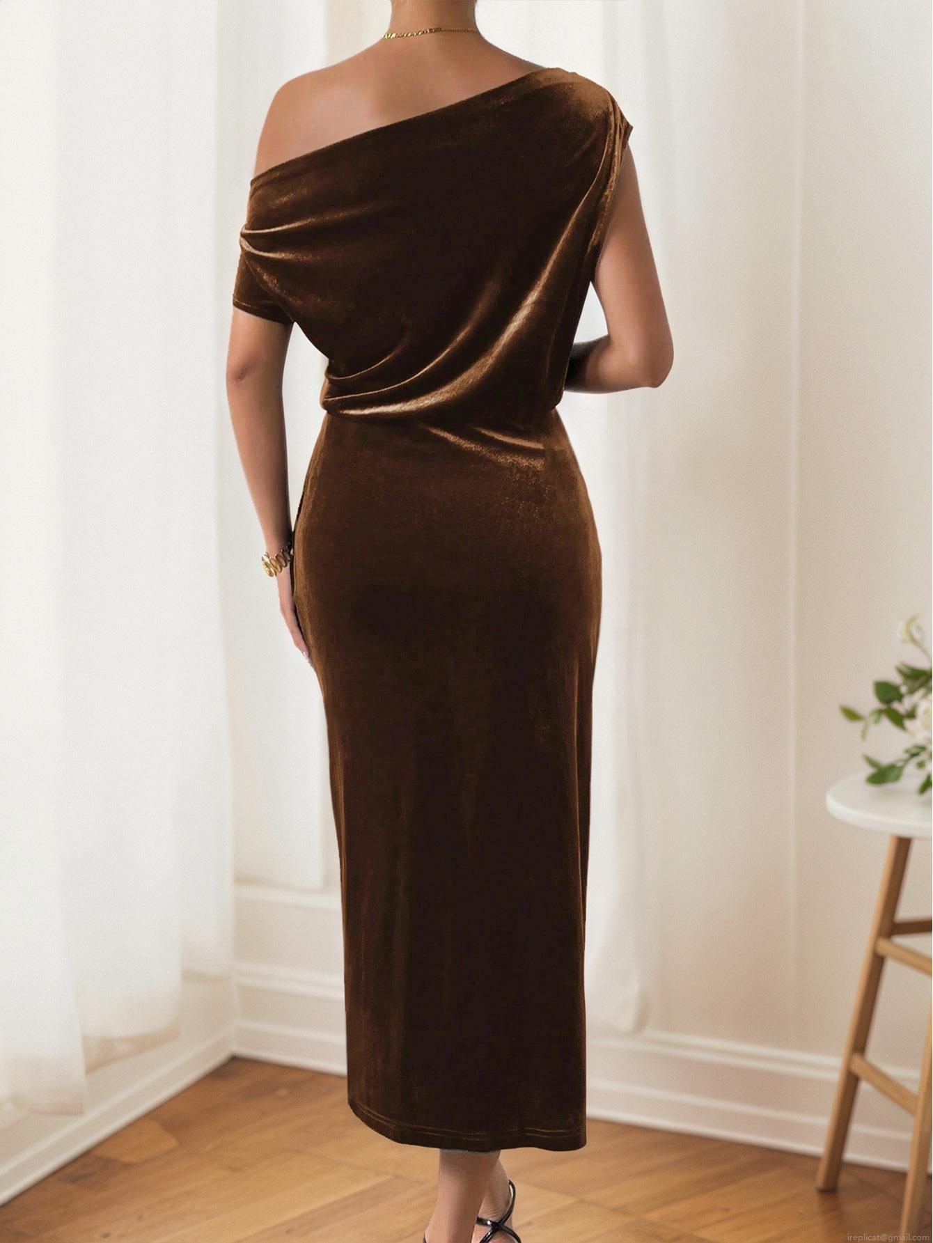 • Women's Elegant Velvet Off Shoulder Midi Dress Sexy Side Split Ruched Bodycon Evening Party Polyester Elastane Long Sleeve Slim Fit Dress Brown