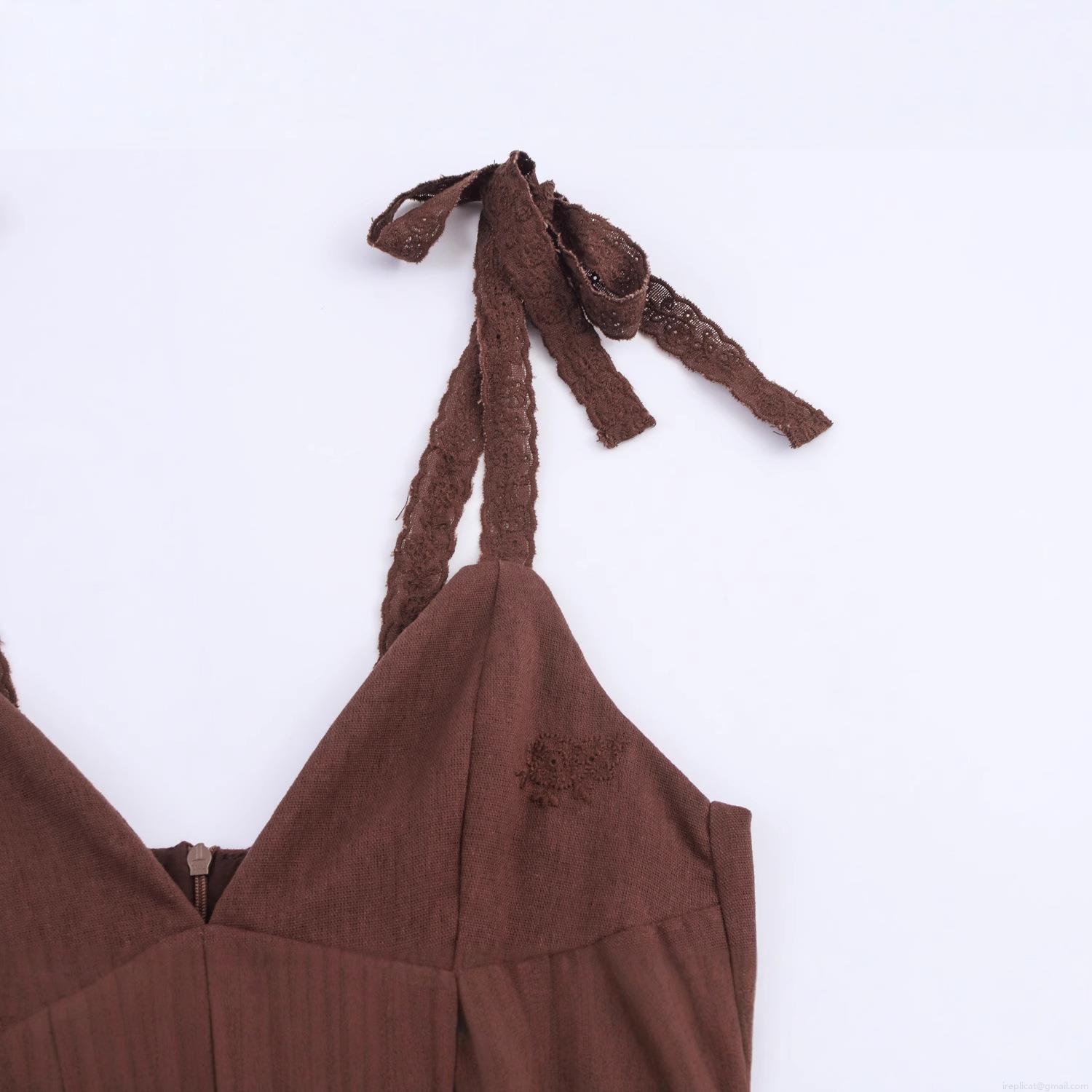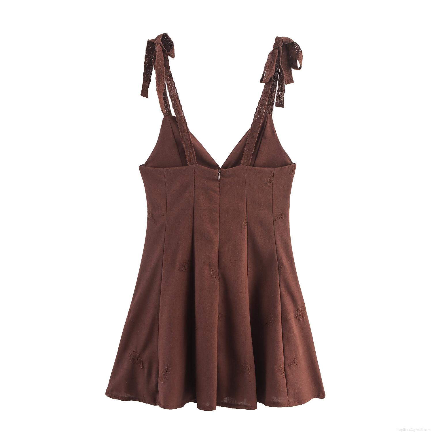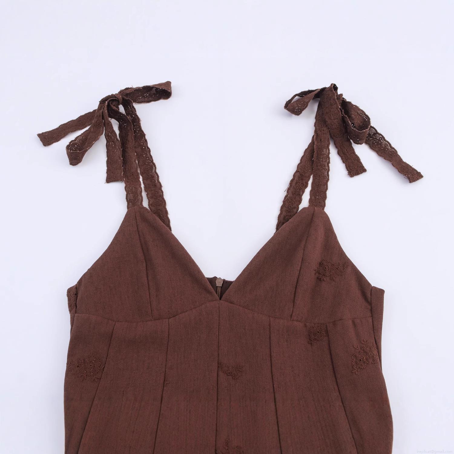 • Women's Elegant V-Neck Coffee Brown Floral Embroidery Midi Dress Cotton Blend Adjustable Bow Straps A-Line Sling Dress For Party Summer Vacation Celebrity Style
