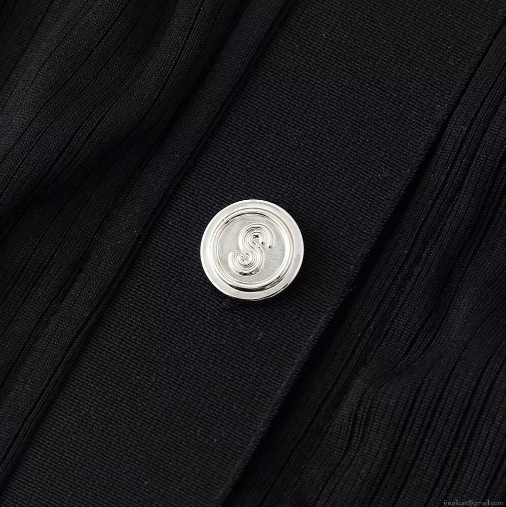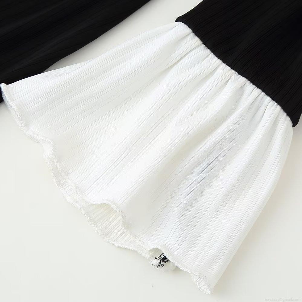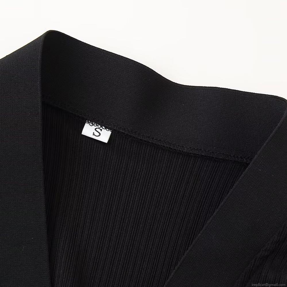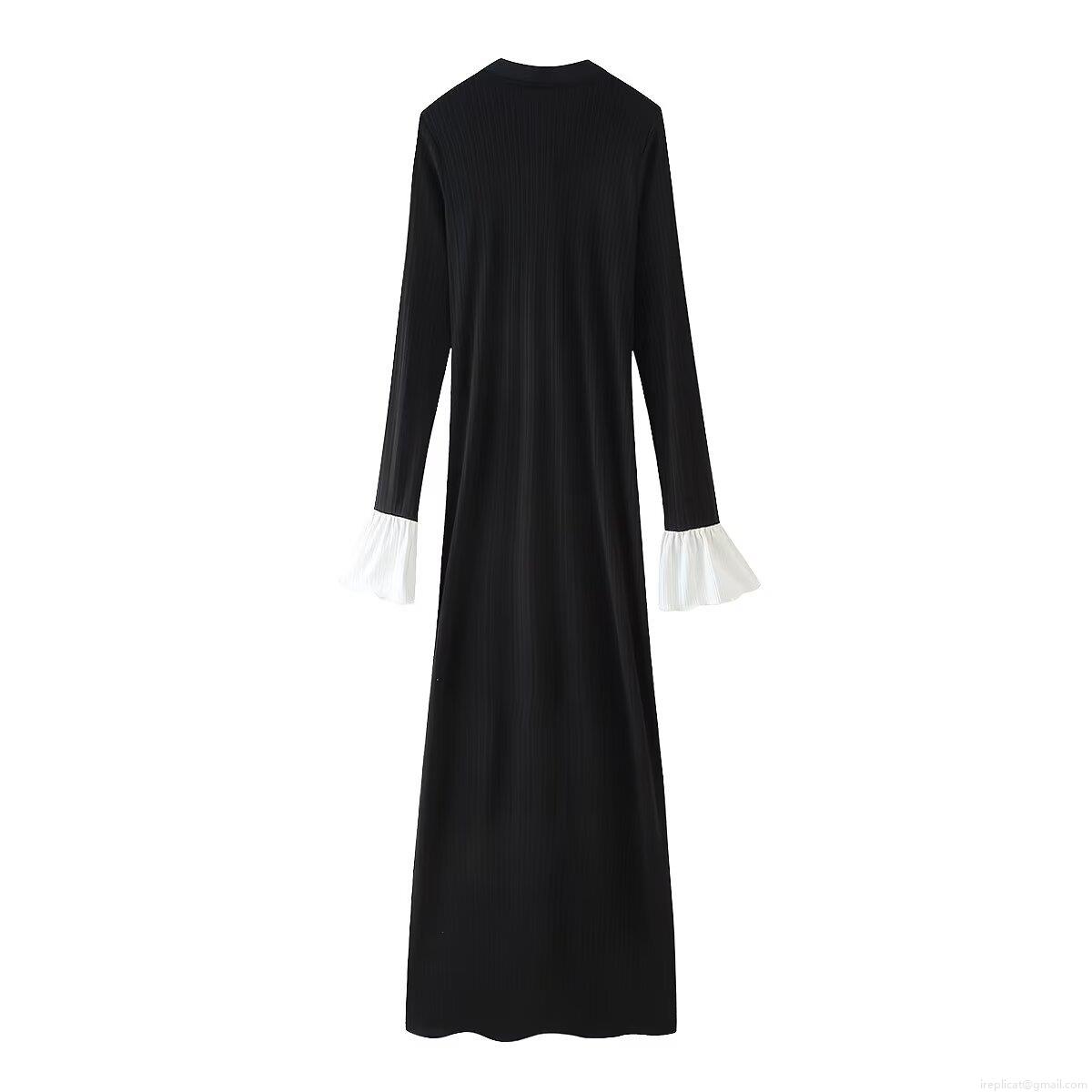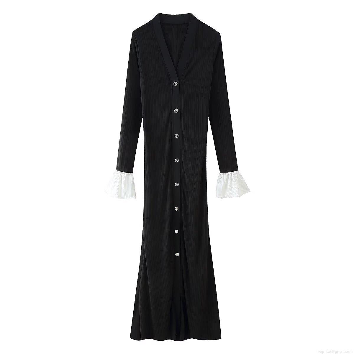 Women's Elegant V-Neck Ribbed Knit Bodycon Midi Dress Long Sleeve Contrast Ruffle Cuffs Button Front Slim Fit Solid Color Knitwear Dress