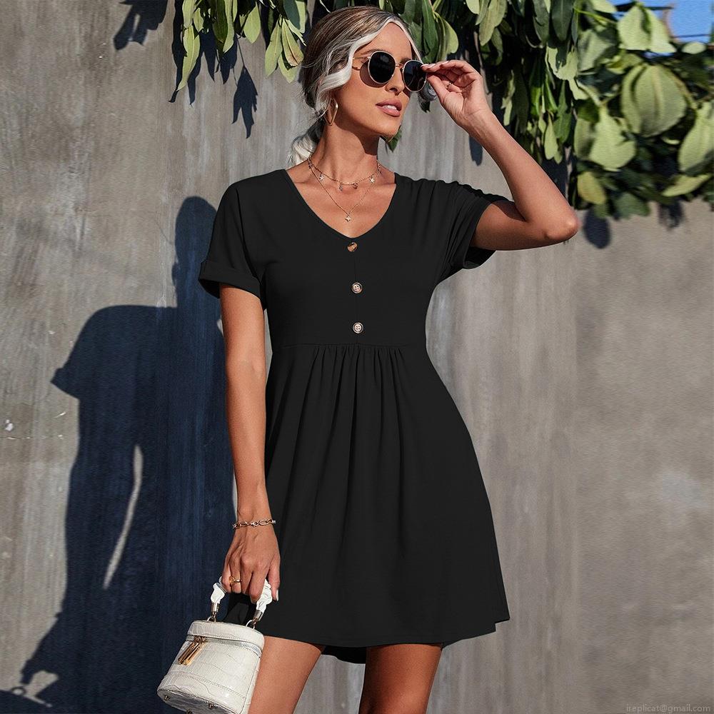 • Women's Elegant V-Neck Short Sleeve Dress Casual Solid Color Cotton Blend Knit Dress With Buttons Decor High Waist Pleated Midi Dress For Office Daily Wear