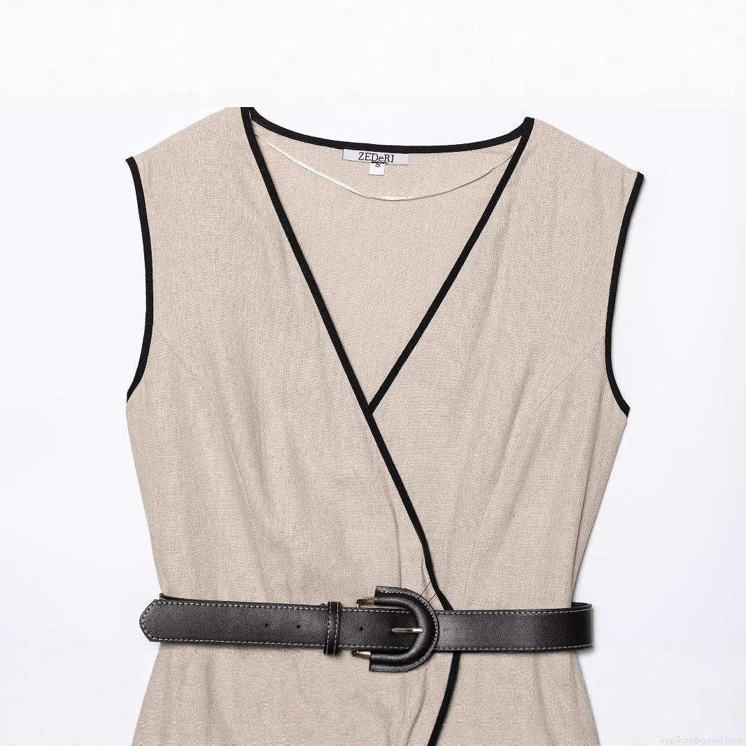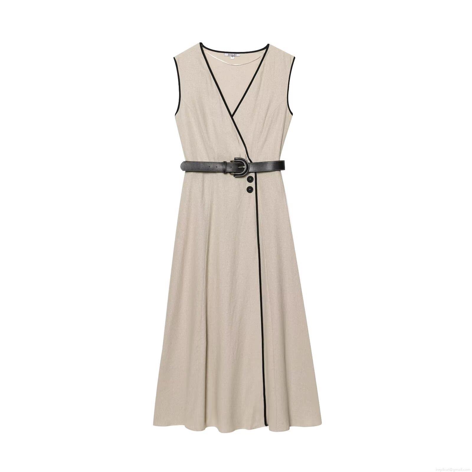 • Women's Elegant V-Neck Sleeveless Midi Dress Cotton Linen Blend Contrast Piping A-Line Dress With Belt For Office Party Summer Casual Khaki Beige Clothing