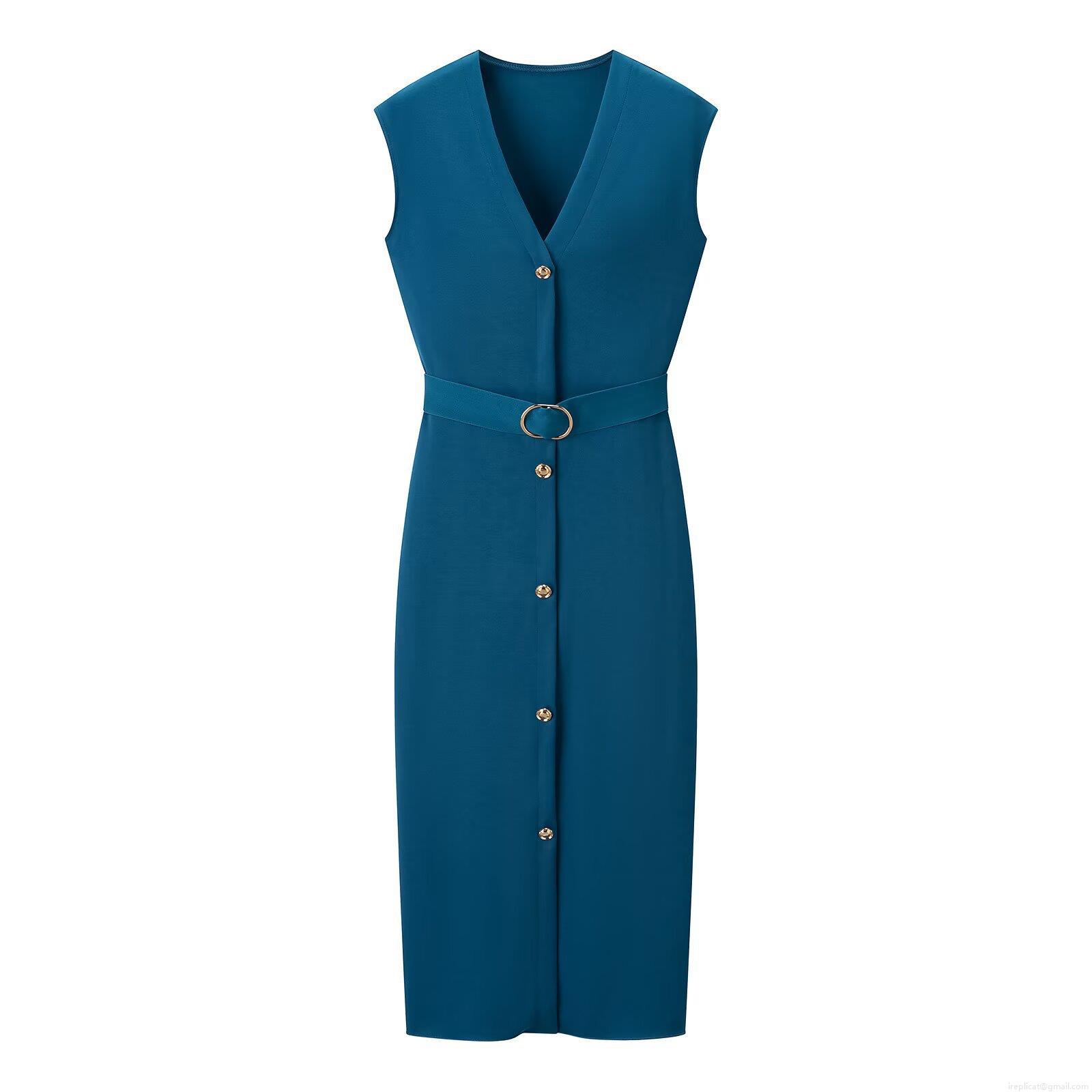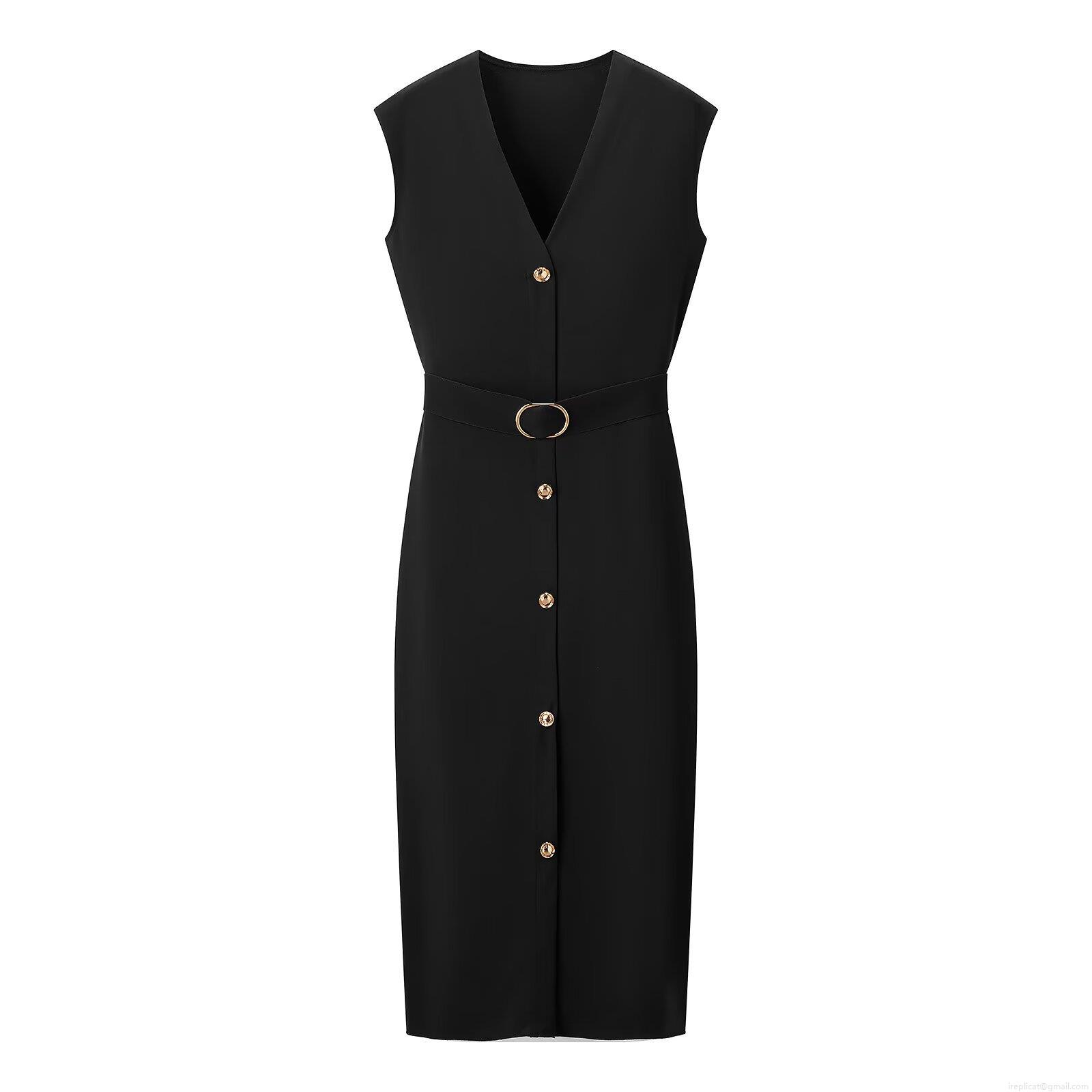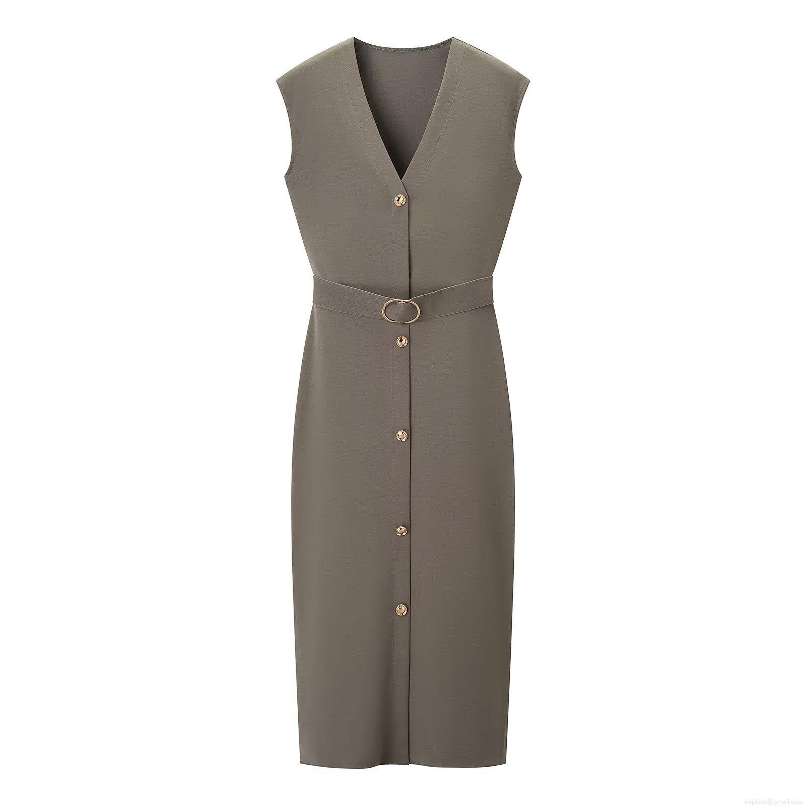 • Women's Elegant V-Neck Sleeveless Midi Dress Polyester Cotton Blend Slim Fit Single Breasted Bodycon Summer Dress With Gold Buckle Belt For Office Party