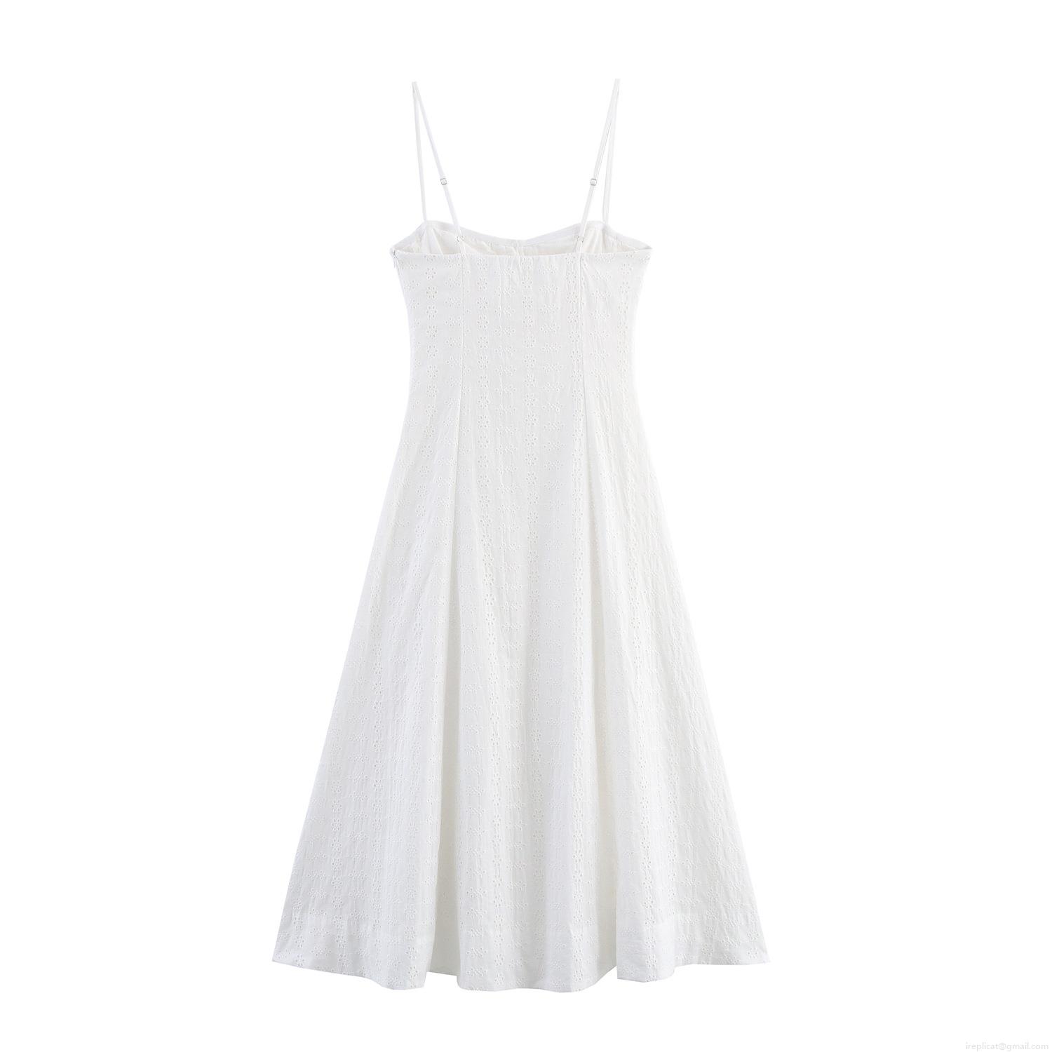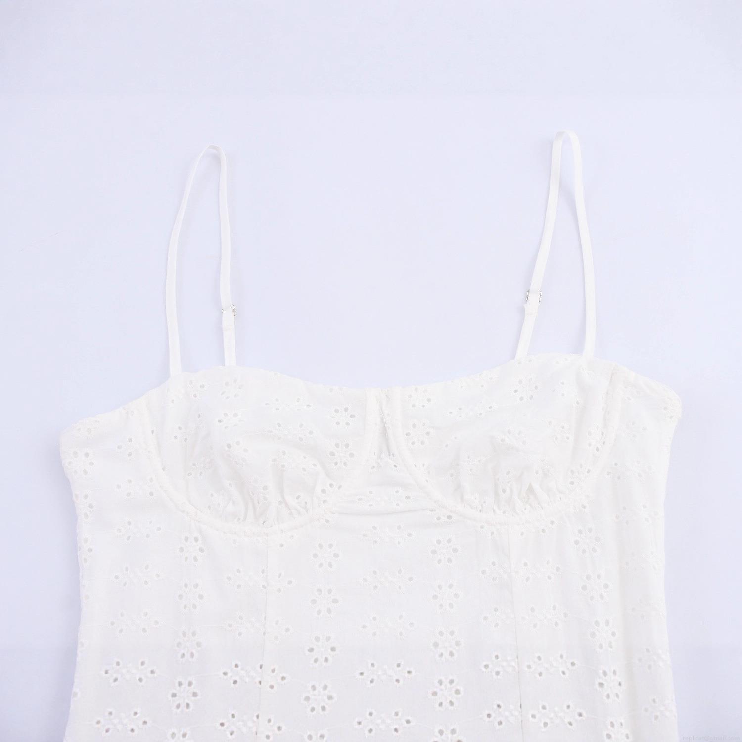 Women's Elegant White Eyelet Embroidery Midi Dress Cotton Blend Corset Bustier Spaghetti Strap Hollow Out A-Line Party Dress