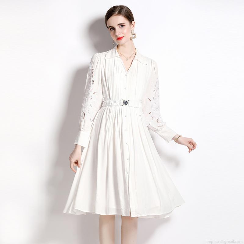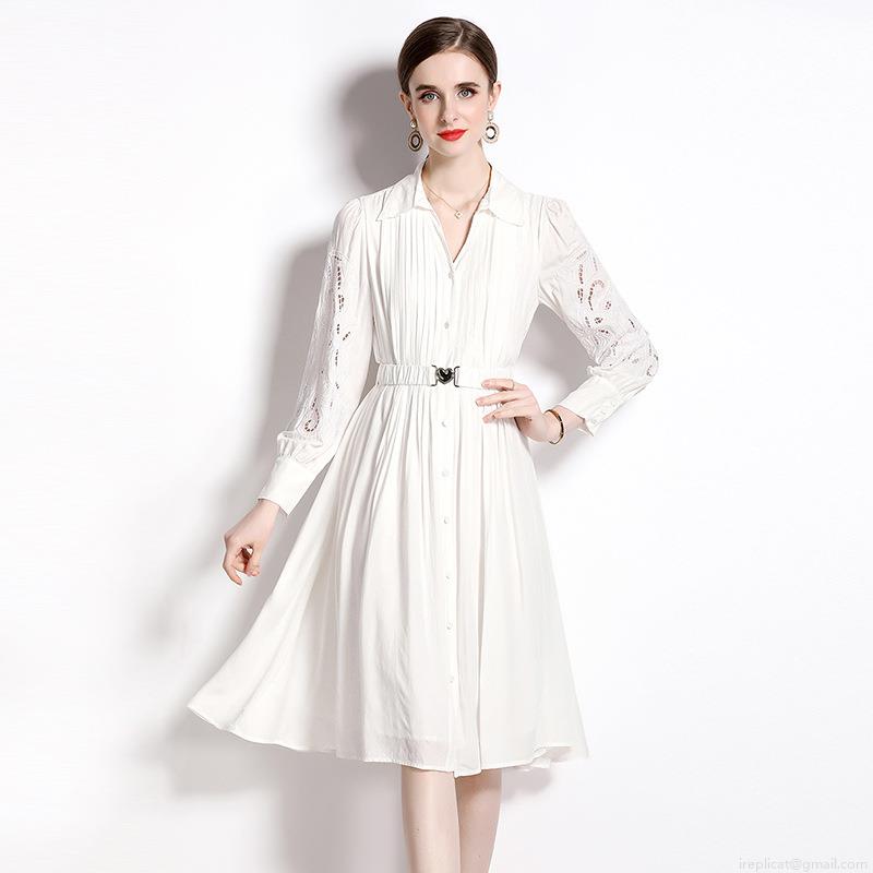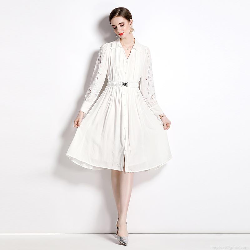 • Women's Elegant White Midi Dress Hollow Out Embroidery Long Sleeve Button Up Shirt Dress With Heart Buckle Belt For Party Wedding Guest Ladies
