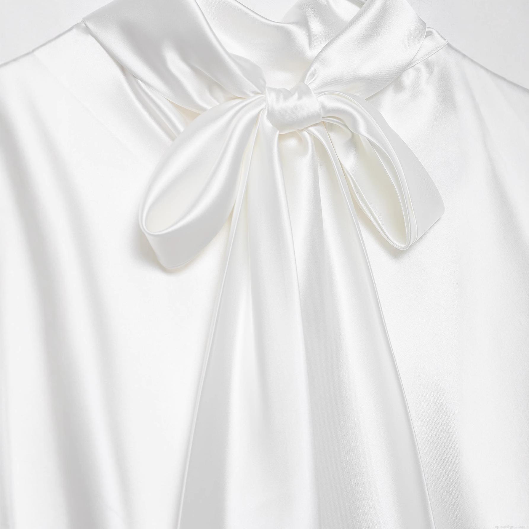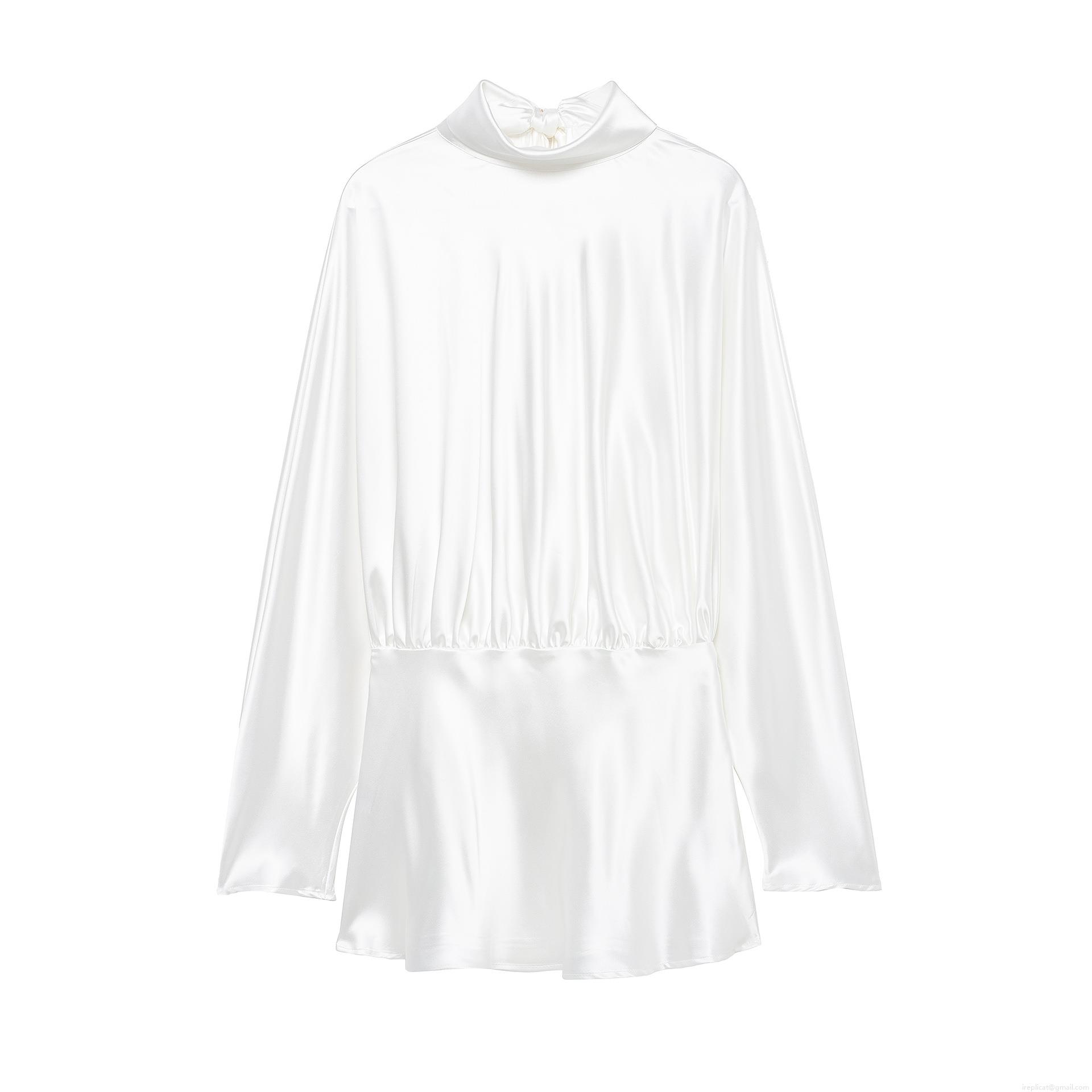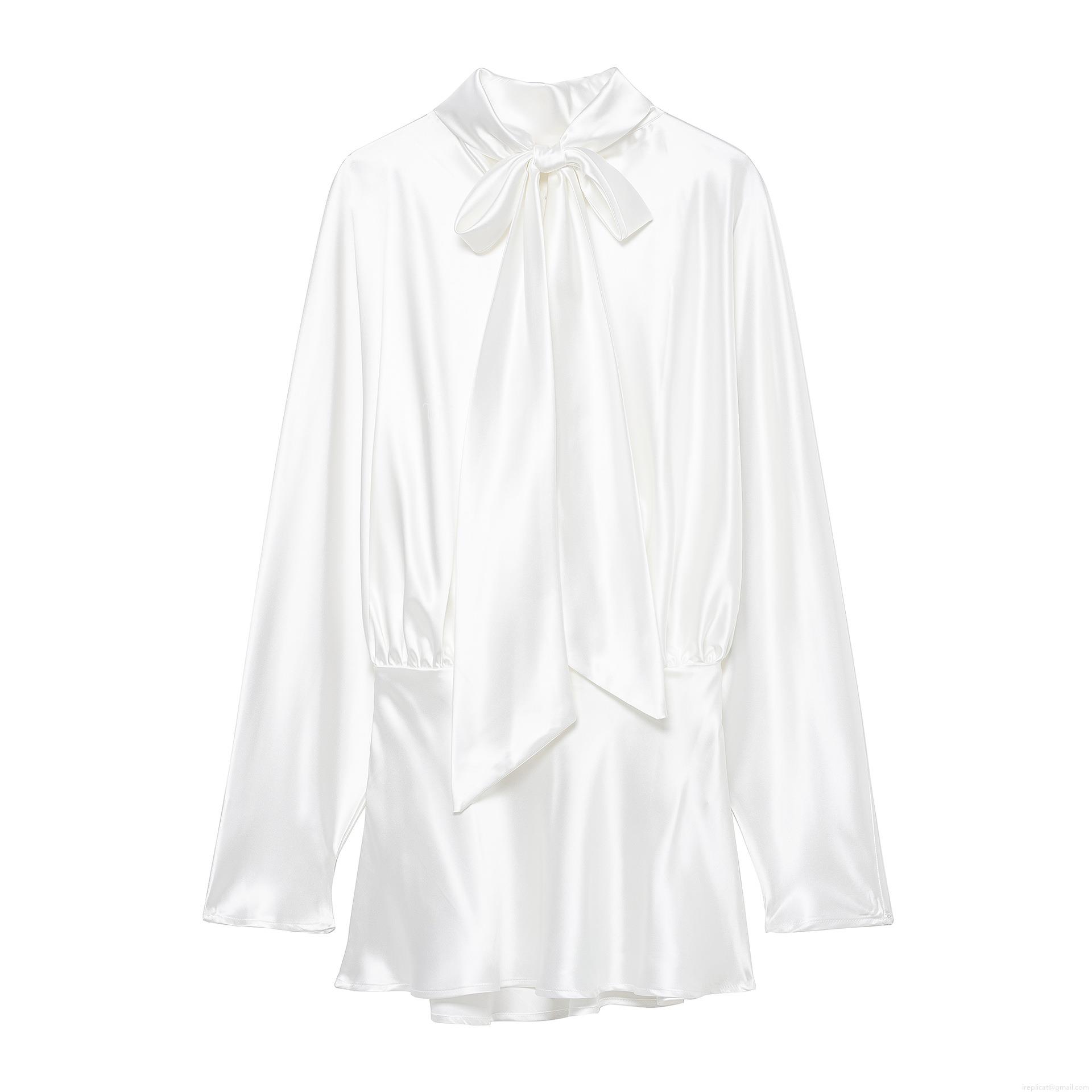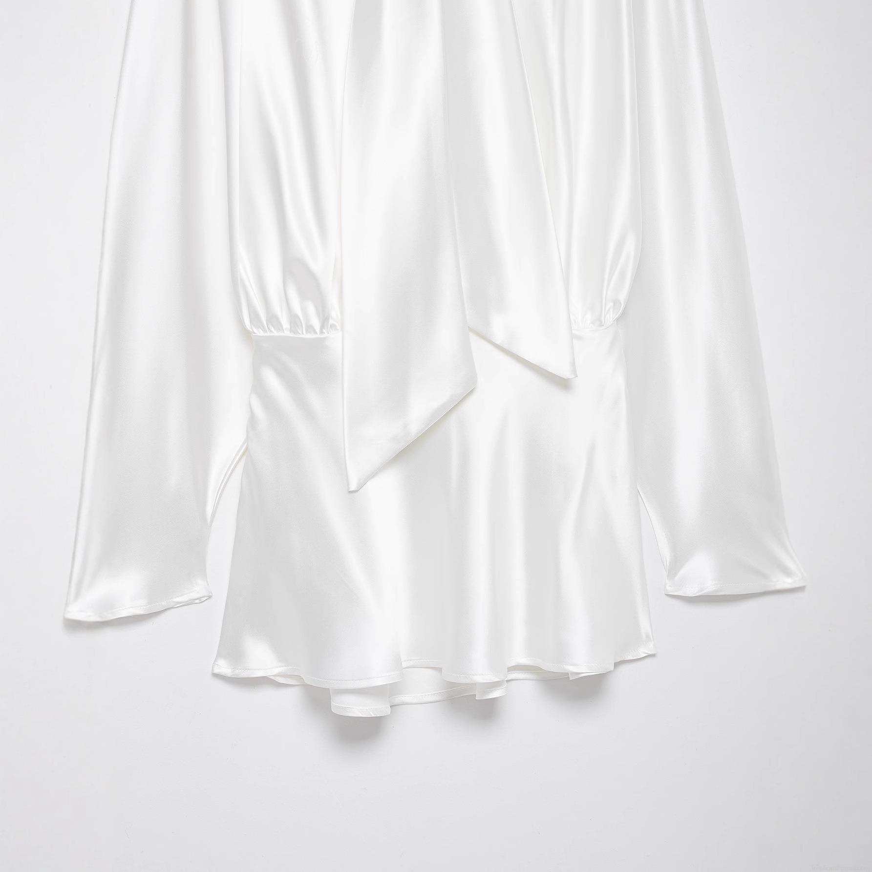 • Women's Elegant White Satin Bow Tie Midi Dress Long Sleeve Stand Collar Ruched Waist Shirt Dress For Formal Party Social Event Celebrity Style Chic Lady Wear