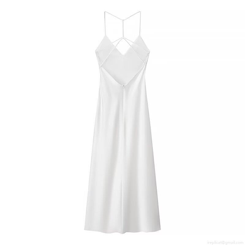 • Women's Elegant White Satin Cami Dress Sexy Cross Backless Midi Dress Sleeveless Solid Color Evening Party Slip Dress For Ladies
